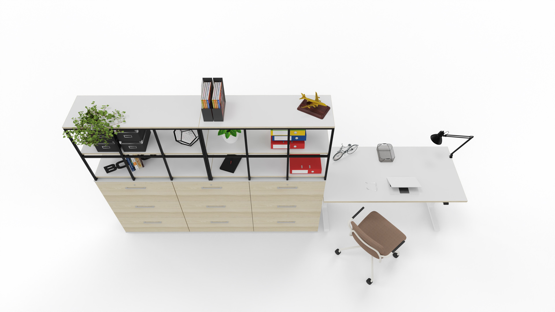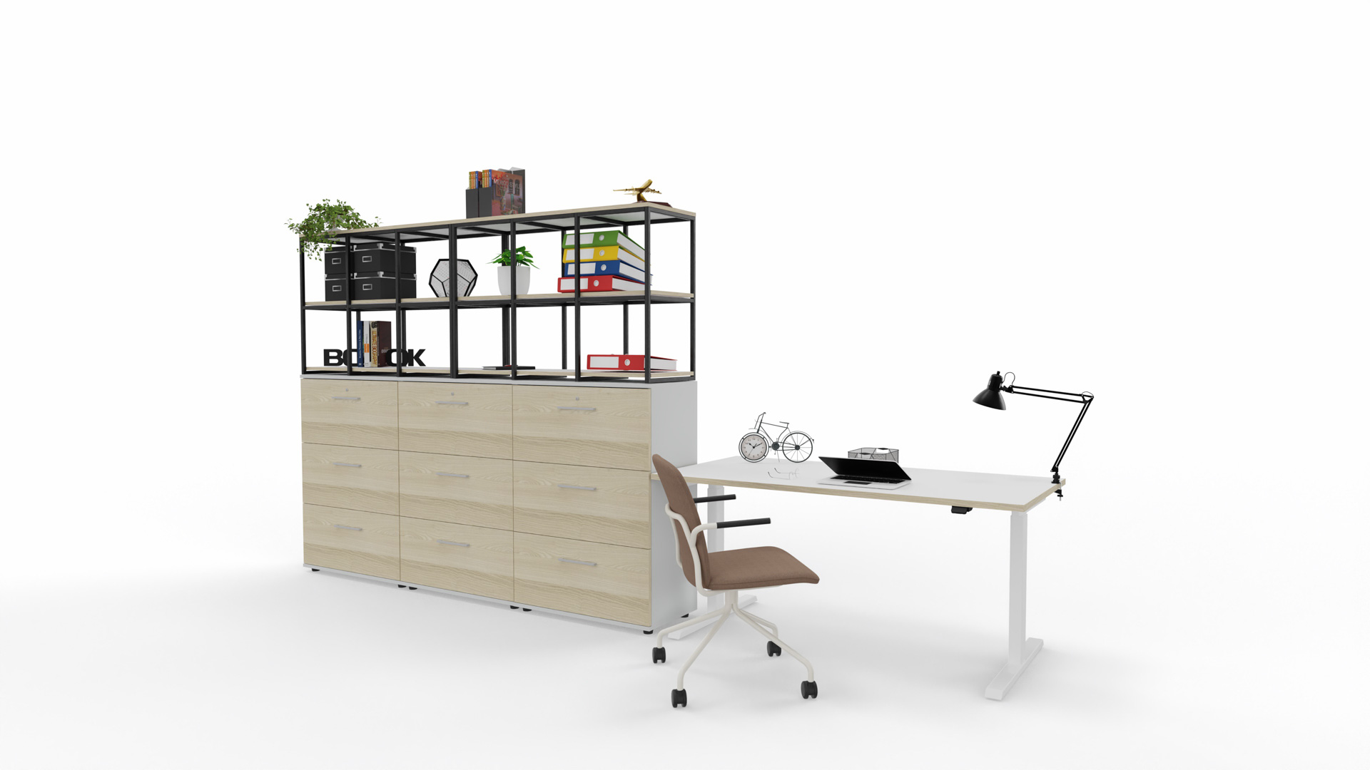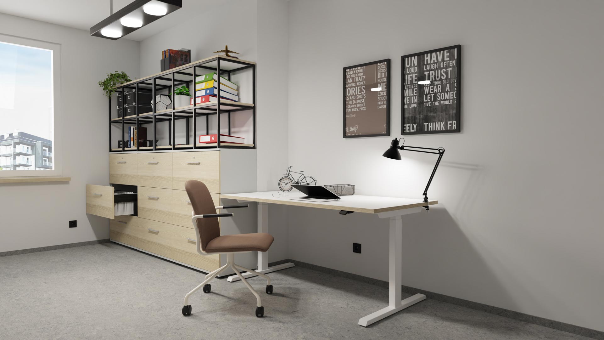 Aranżacja przestrzeni z wykorzystaniem biurka Lano-E 300 IC T z elektryczną regulacją wysokości blatu doskonale sprawdzi się w domowym biurze. System regałów Aura połączony z szafkami na teczki zawieszkowe zapewni dobrą organizację i stylowy wygląd.