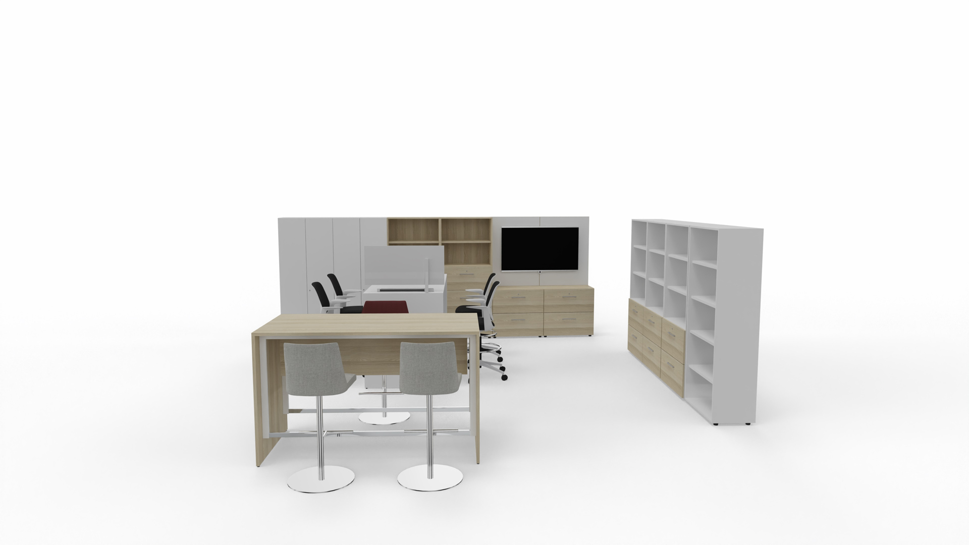 Układ stołów Idea P z zabudową płytową połączony z szafami aktowymi i regałami doskonale sprawdzi się w biurze, gdzie potrzebne jest miejsce na szybkie spotkania, a także na pracę zespołową. Stoły Idea P są odpowiedzią na potrzeby współczesnych użytkowników i można je swobodnie wkomponować w przestrzeń biurową. Wyposażenie układu przestrzennego w szafy ułatwia przechowywanie i organizację biura.