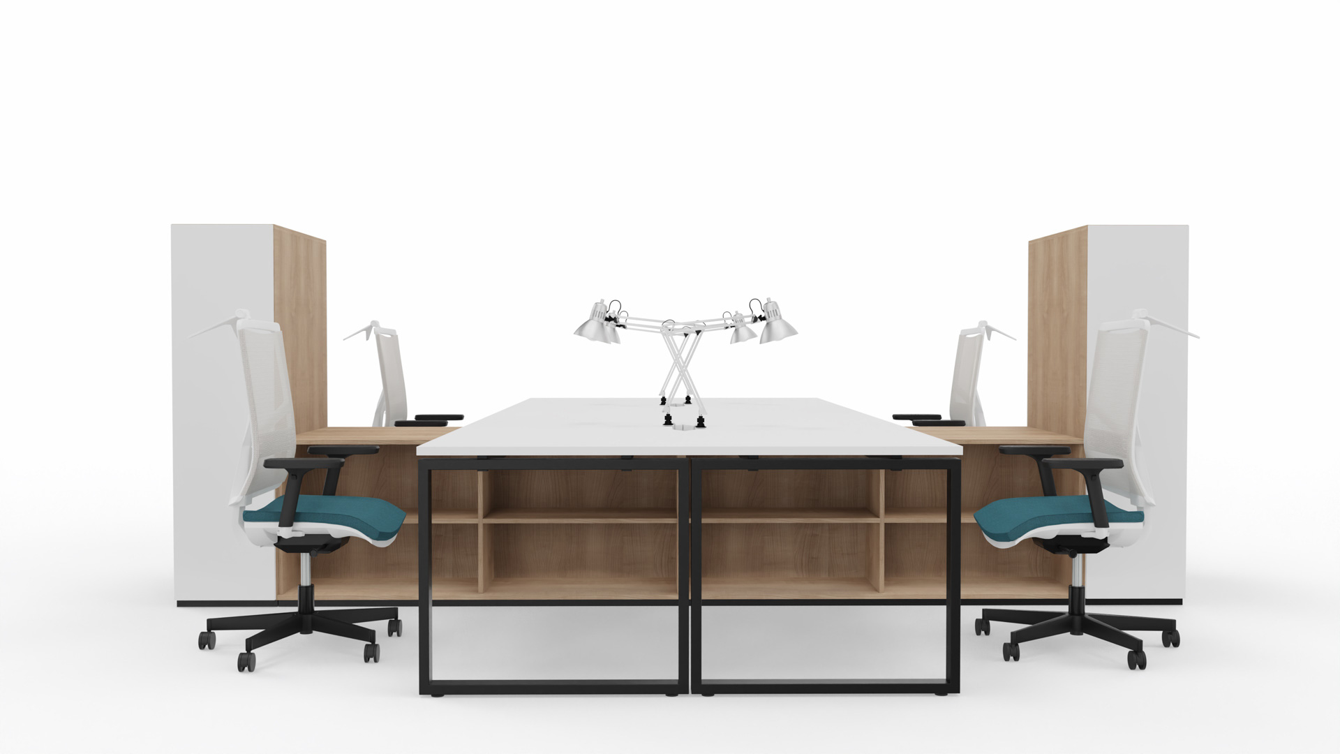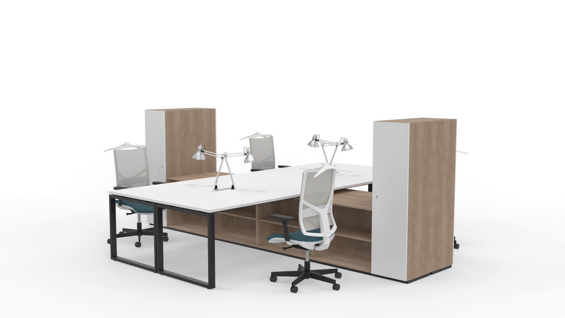 Q-eM desks distinguish themselves by their skid legs and slightly suspended tops, thanks to which the collection forms a splendid combination of functional simplicity and extraordinarily light design. Underdesk sideboards and filing cabinets provide necessary storage space. The set saves office space and results to be excellent for team work.