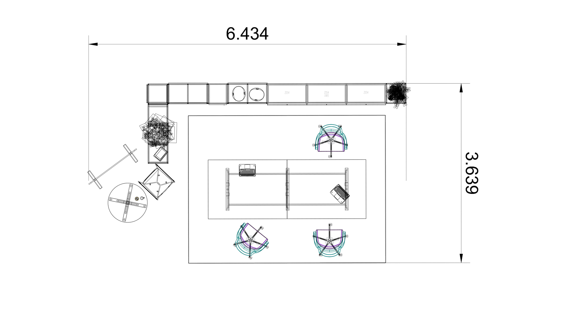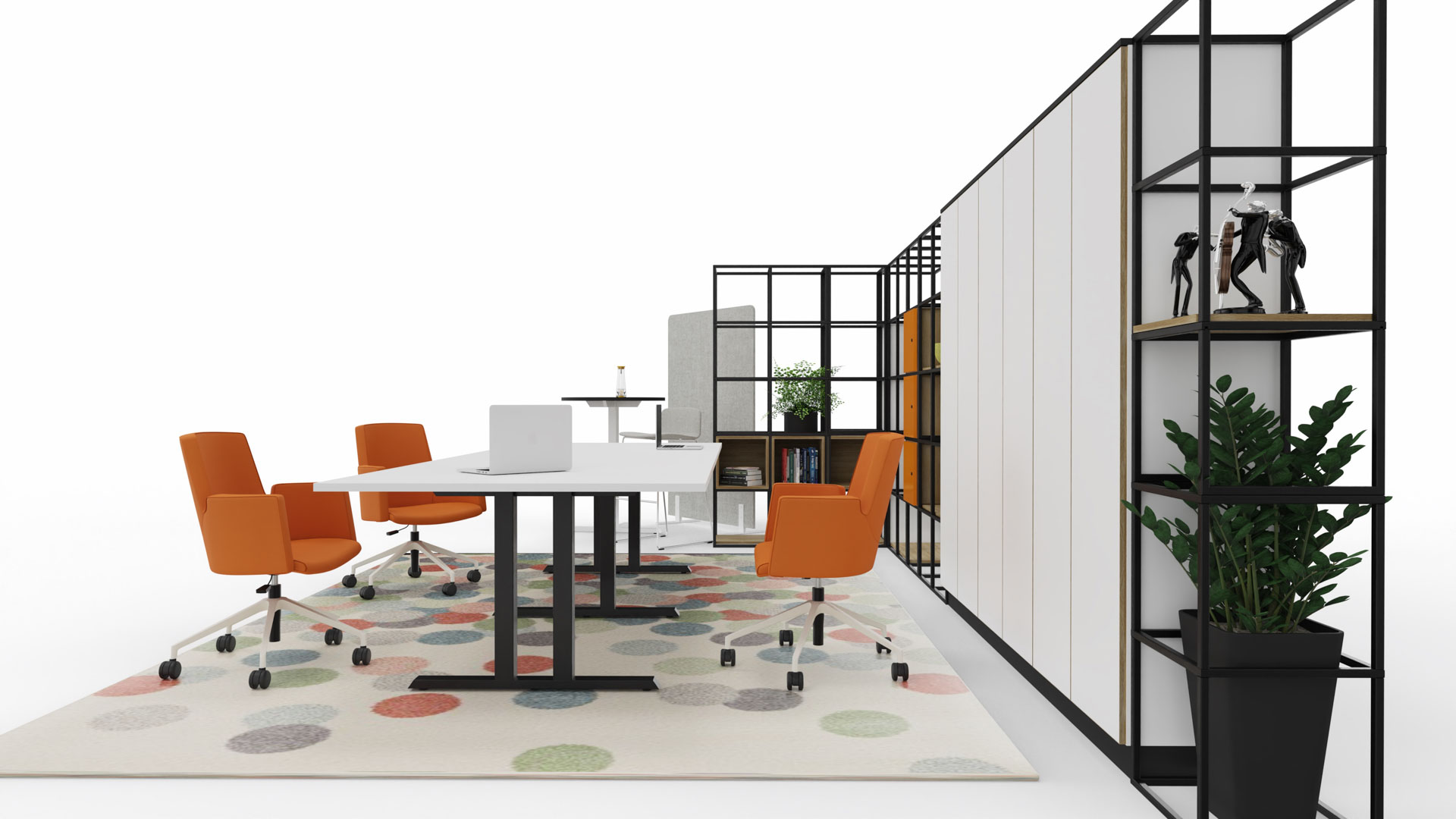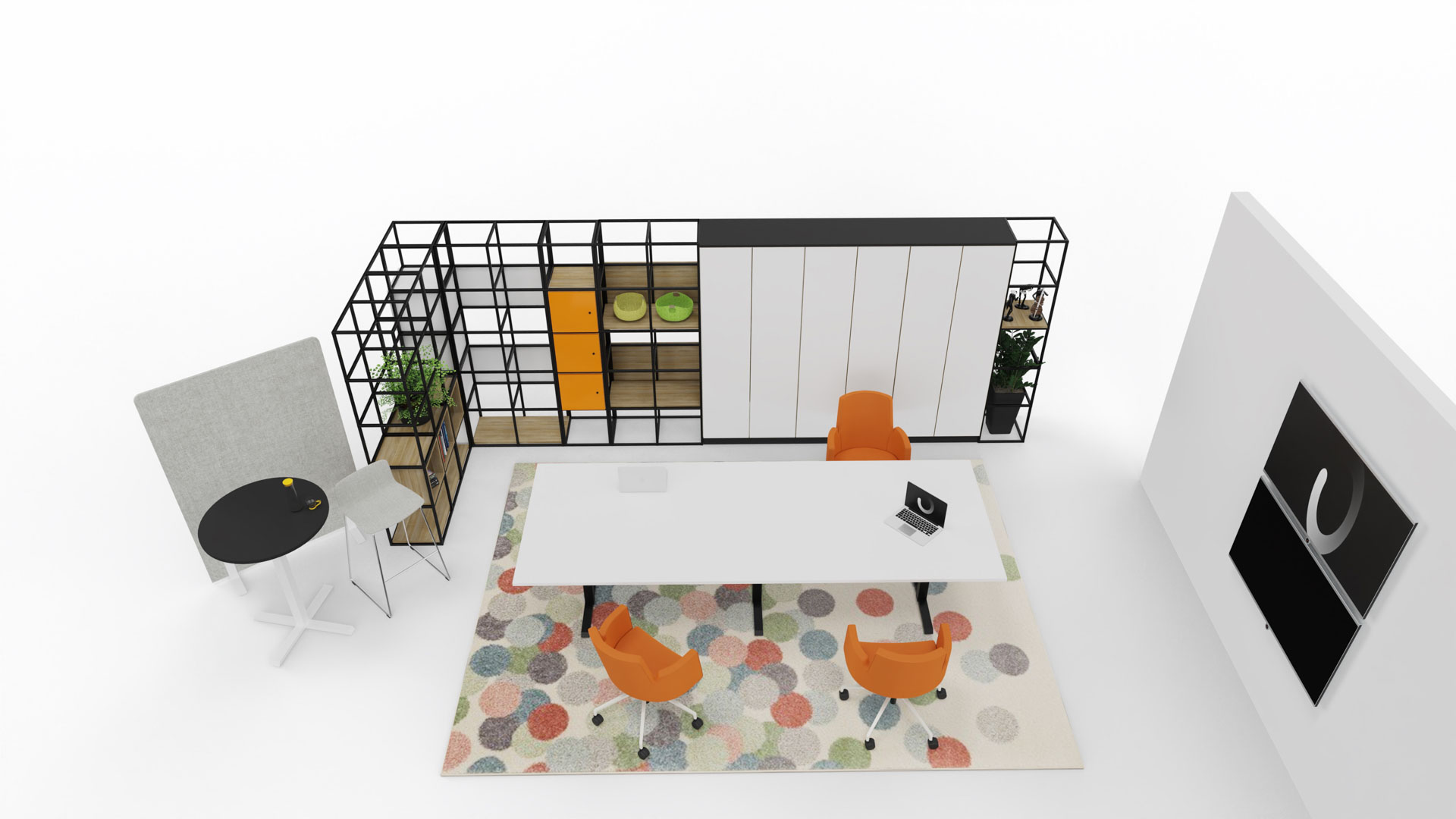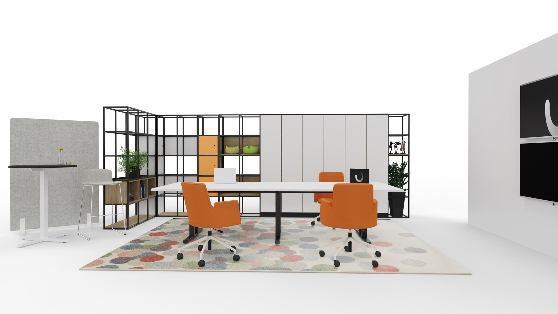 Przestrzeń zaaranżowana z wykorzystaniem stołu konferencyjnego dwuelementowego L-Line doskonale sprawdzi się do omawiania projektów i pracy w zespołach. Szafy na cokołach płytowych zapewnią miejsce do przechowywania, a system Aura, który wraz ze ścianką akustyczną S40 wydziela przestrzeń, pozwoli udekorować biuro zgodnie z indywidualnymi preferencjami.