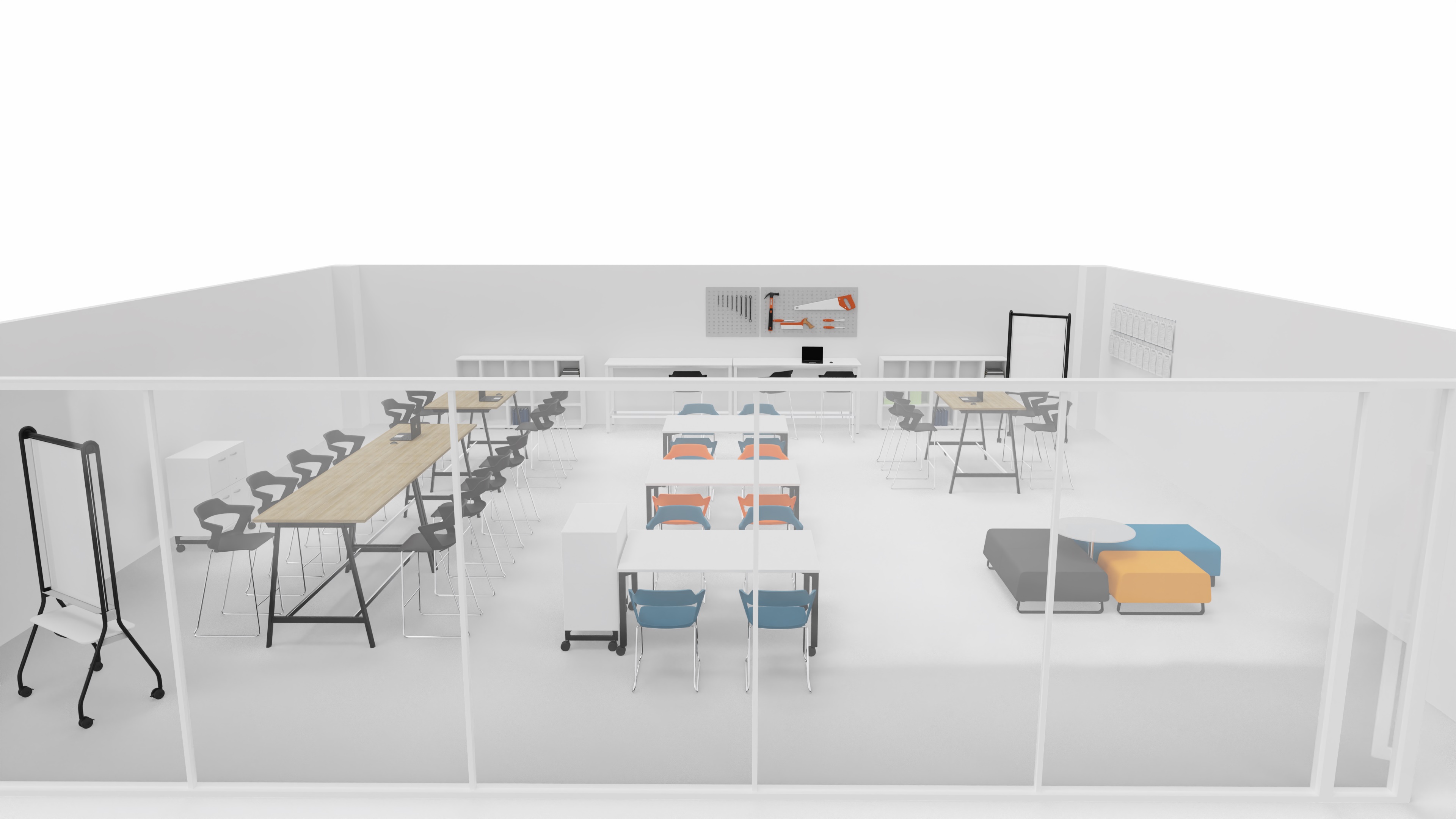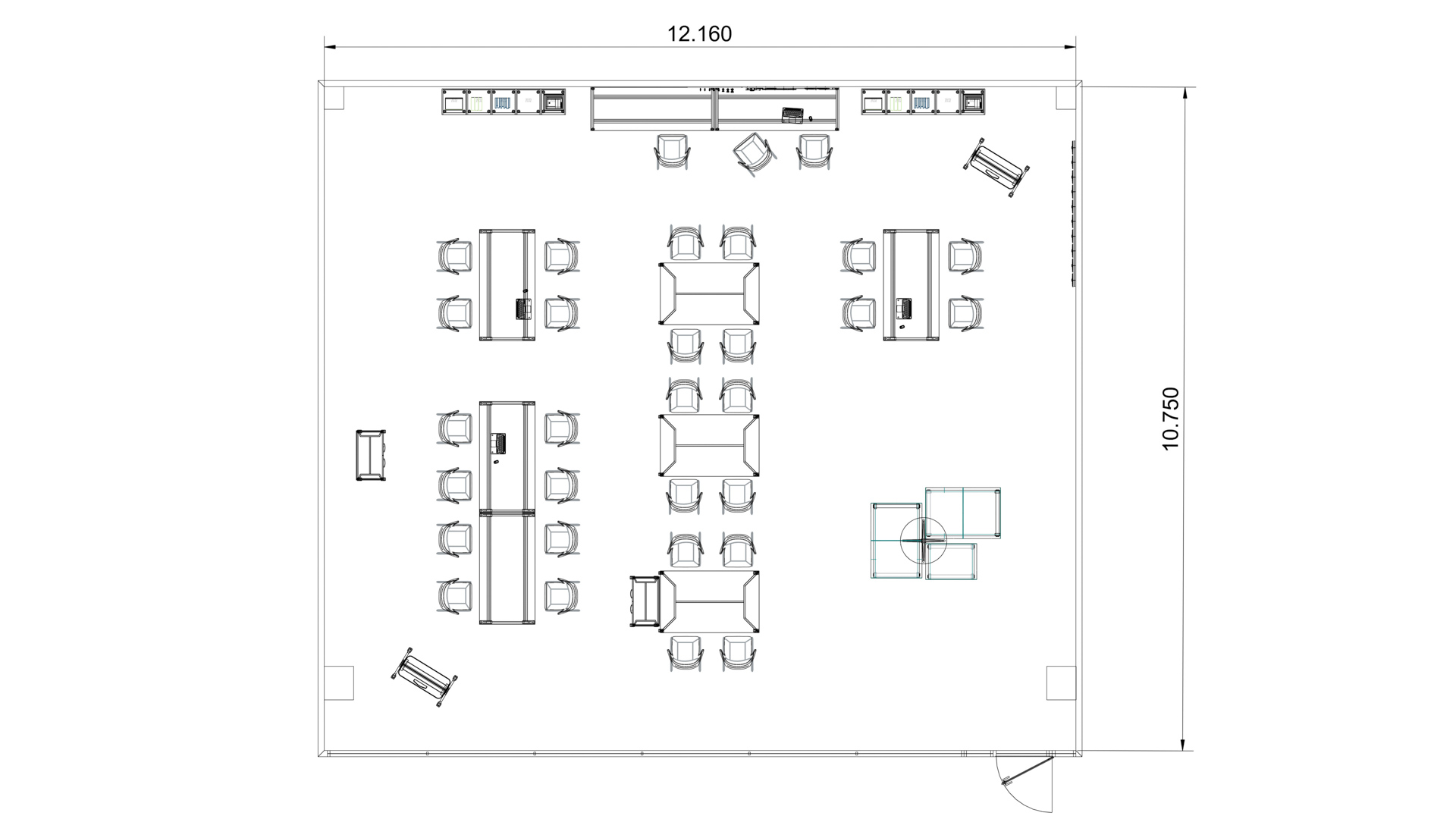Układ wielofunkcjonalny sprosta oczekiwaniom biur wymagających elastycznych sposbów aranżowania przestrzeni. Stoły Idea A i Idea H sprawdzą się przy spotkaniach i szkoleniach, a biurka K-eM Space Mobile zapewniają komfortowe i ergonomiczne warunki do pracy wspólnej. Szafki mobilne Wariant idealnie wpisują się w dynamiczny klimat przestrzeni. Regały otwarte pozwalają na wiele możliwości ekspozycyjnych i dekoracyjnych.