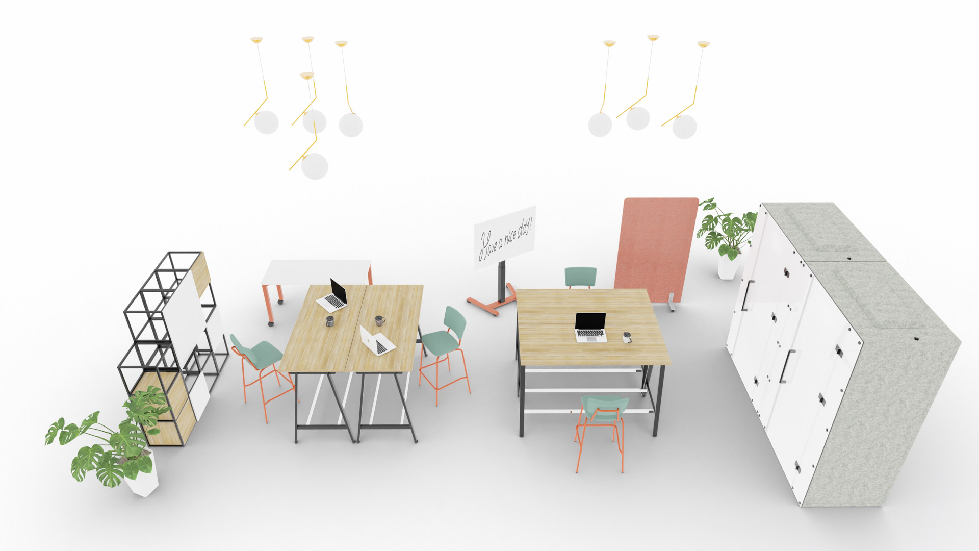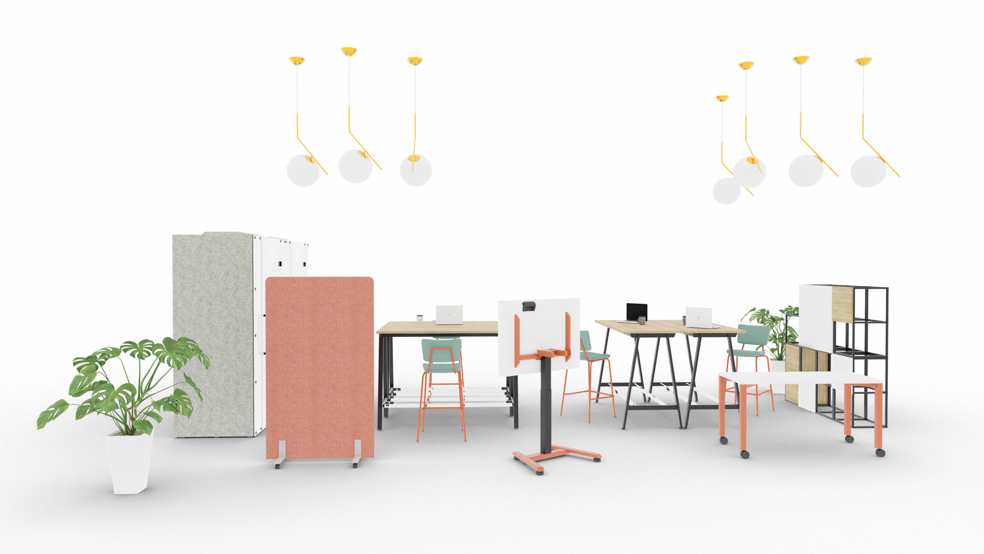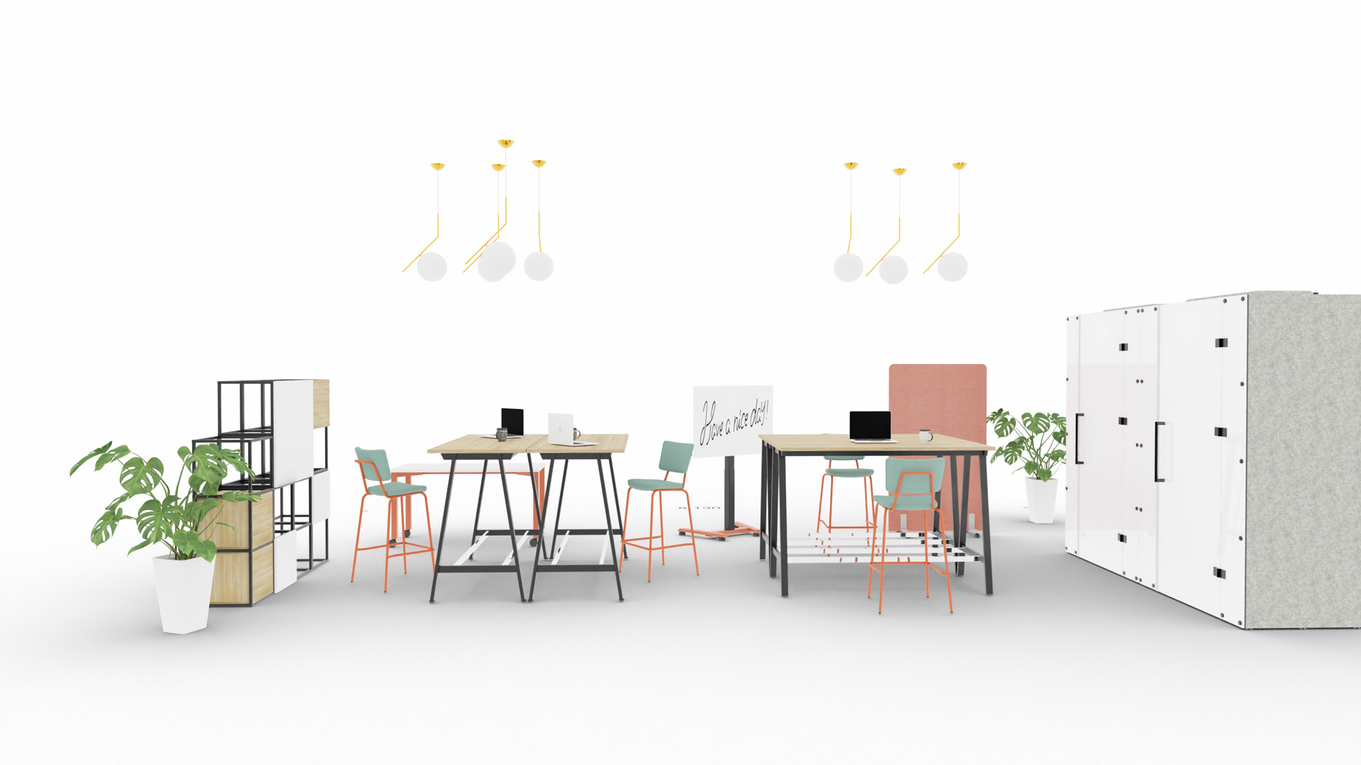 Układ sprawdzi się jako miejsce spotkań i pracy wspólnej, ale także może zostać zaadaptowany na stołówki lub kantyny. Stoły wysokie Idea A o charakterystycznym kształcie nóg ułożonych pod kątem doskonale wpisują się w obowiązujące wzornicze trendy. K-eM Space Mobile dzięki możliwości łatwego przemieszczania dostosuje przestrzeń do bieżących potrzeb, a system Aura zapewni miejsce do przechowywania i ekspozycji.