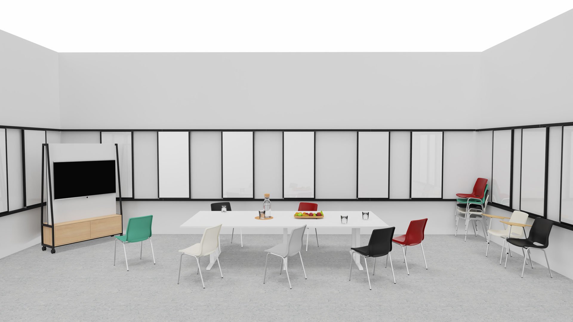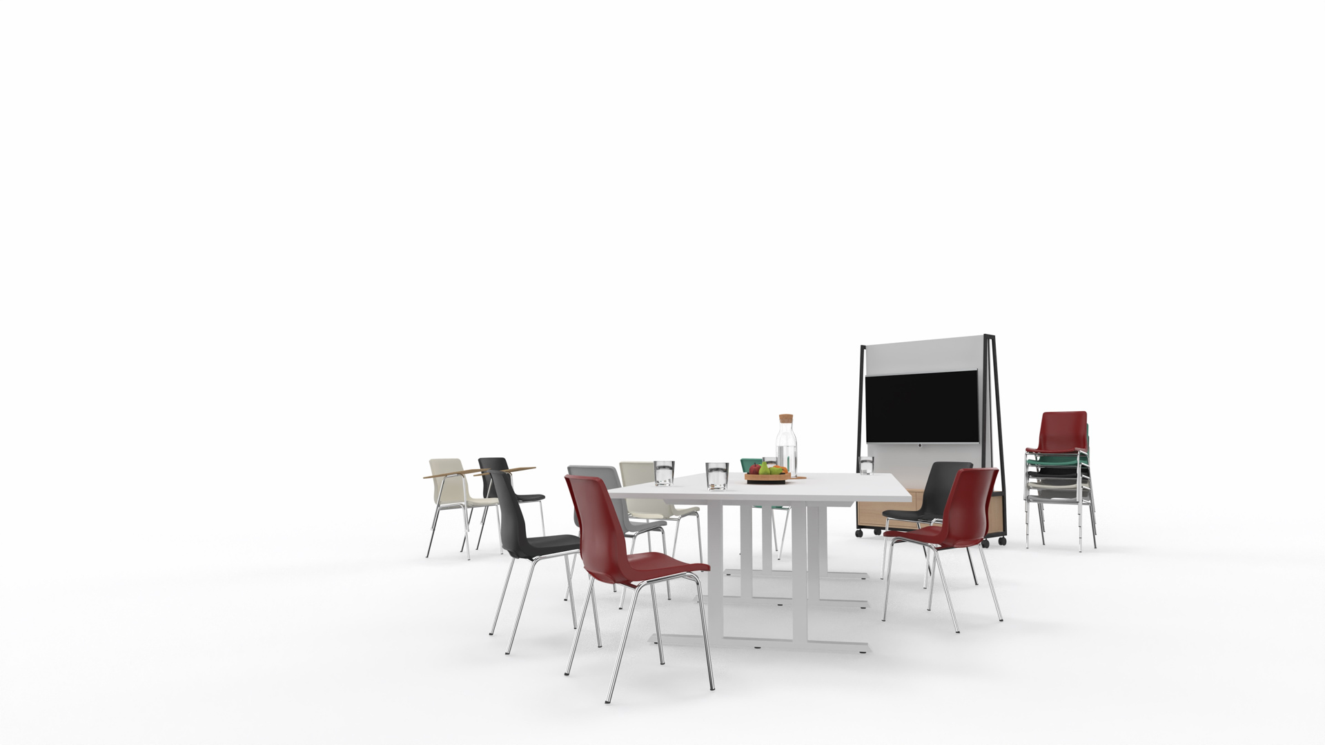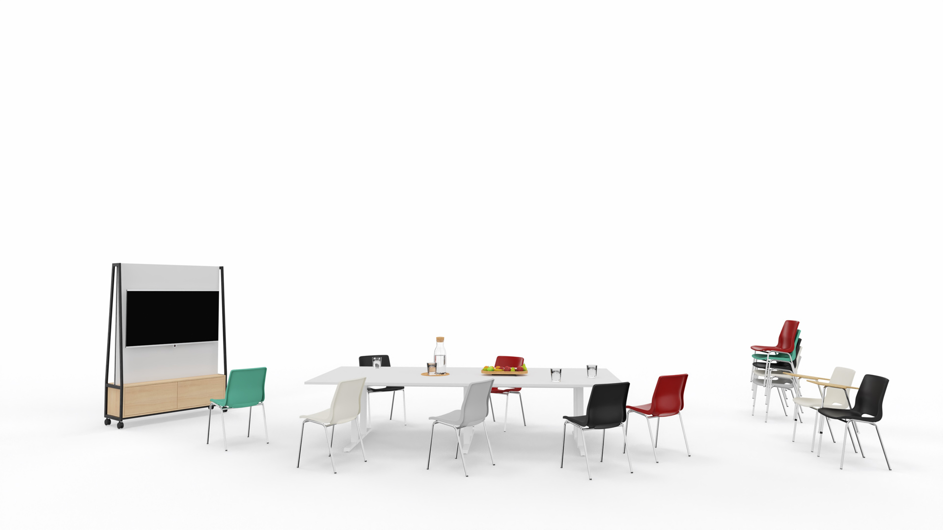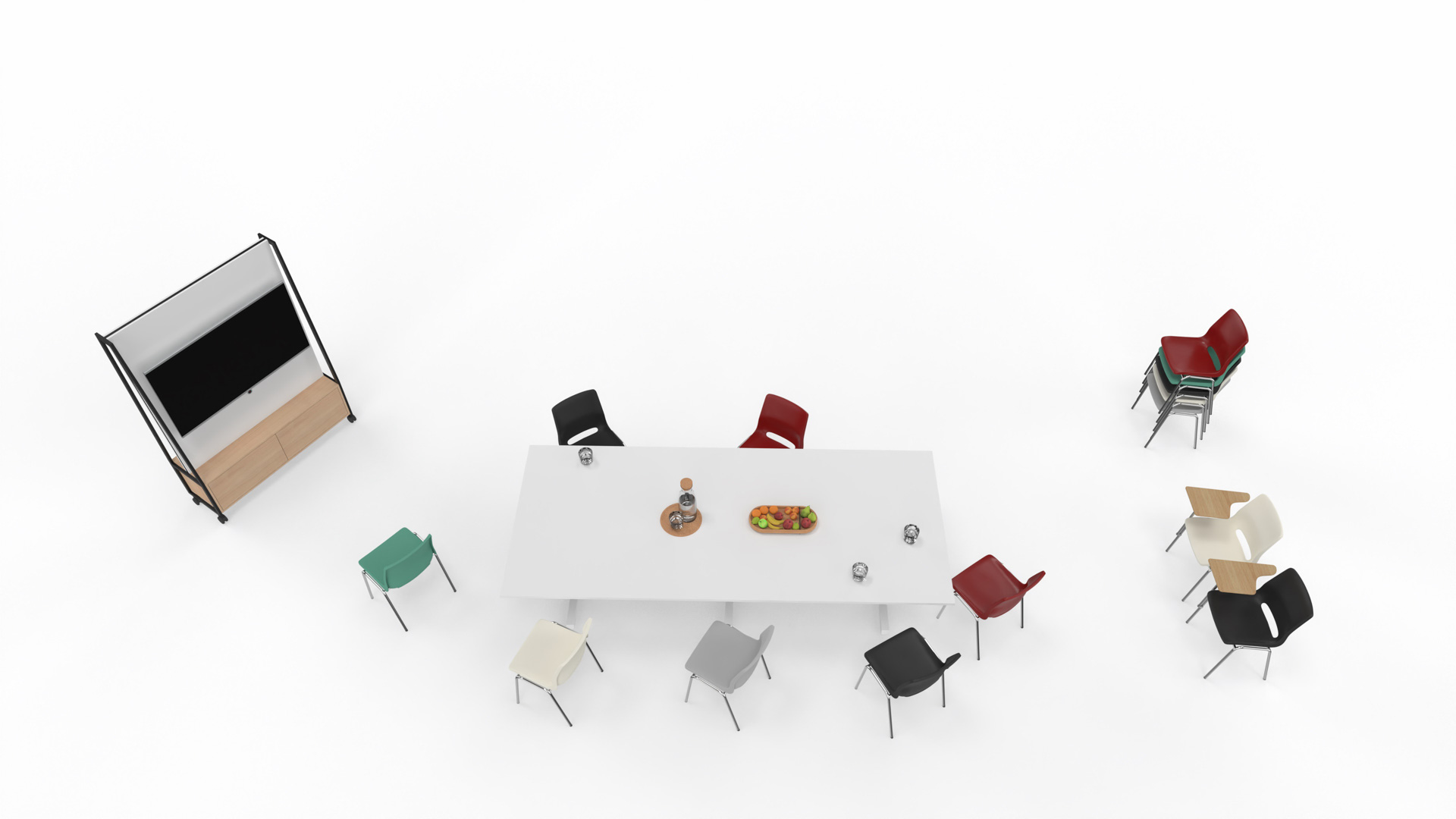 Stół L-Line umożliwia wygodne zaaranżowanie każdego spotkania. Wykorzystanie mobilnego stojaka TV z kolekcji Wariant ułatwia przedstawianie materiałów oraz zapewnia dodatkowe miejsce do przechowywania w sali spotkań.