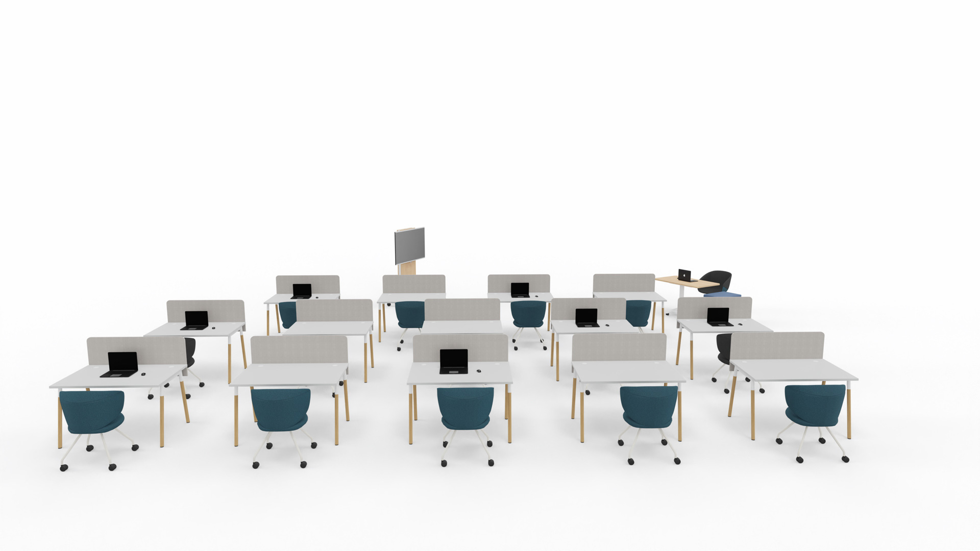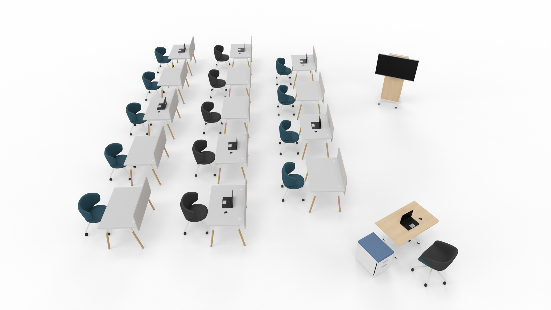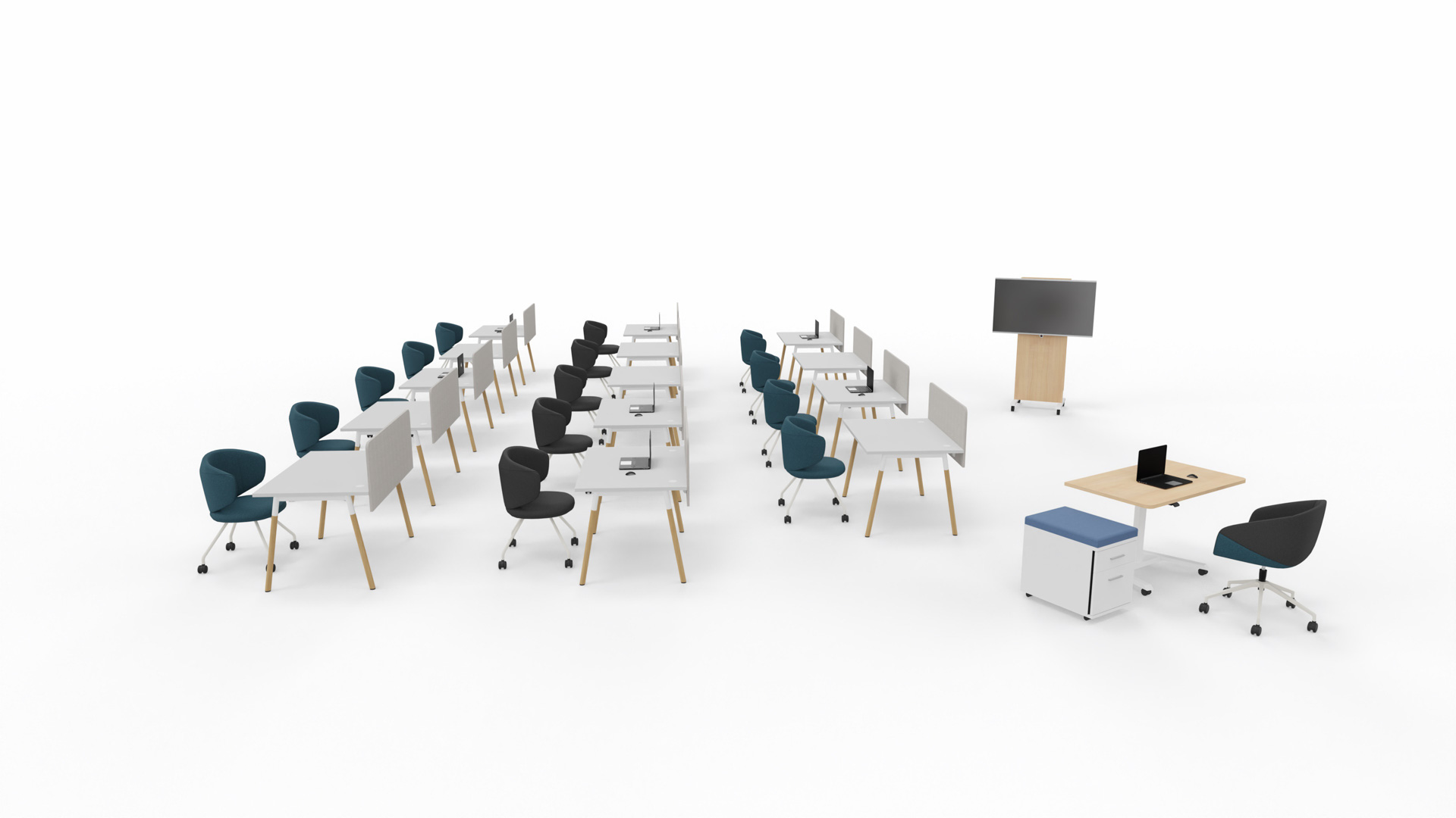 Zastosowanie biurek Op-Lite II Wood O to ekonomia i design, które idą ze sobą w parze. Biurka z drewnianymi nogami, doskonale wpisują się w obecne trendy. Układ sprawdzi się zarówno w salach wykładowych, szkoleniowych czy prezentacyjnych. Prowadzącemu spotkanie wygodę zapewni biurko kompaktowe Wariant z elektryczną regulacją wysokości blatu w połączeniu z kontenerem mobilnym oraz mobilny stojak TV.