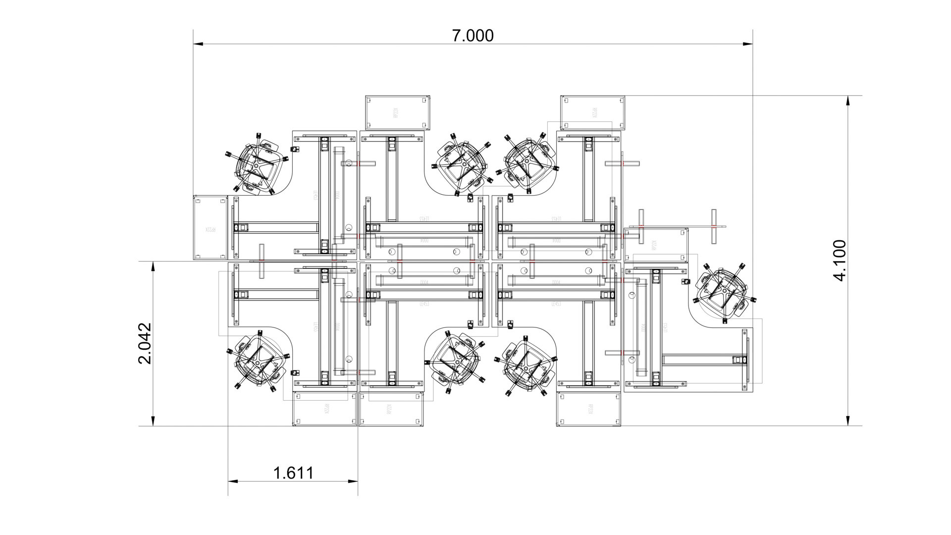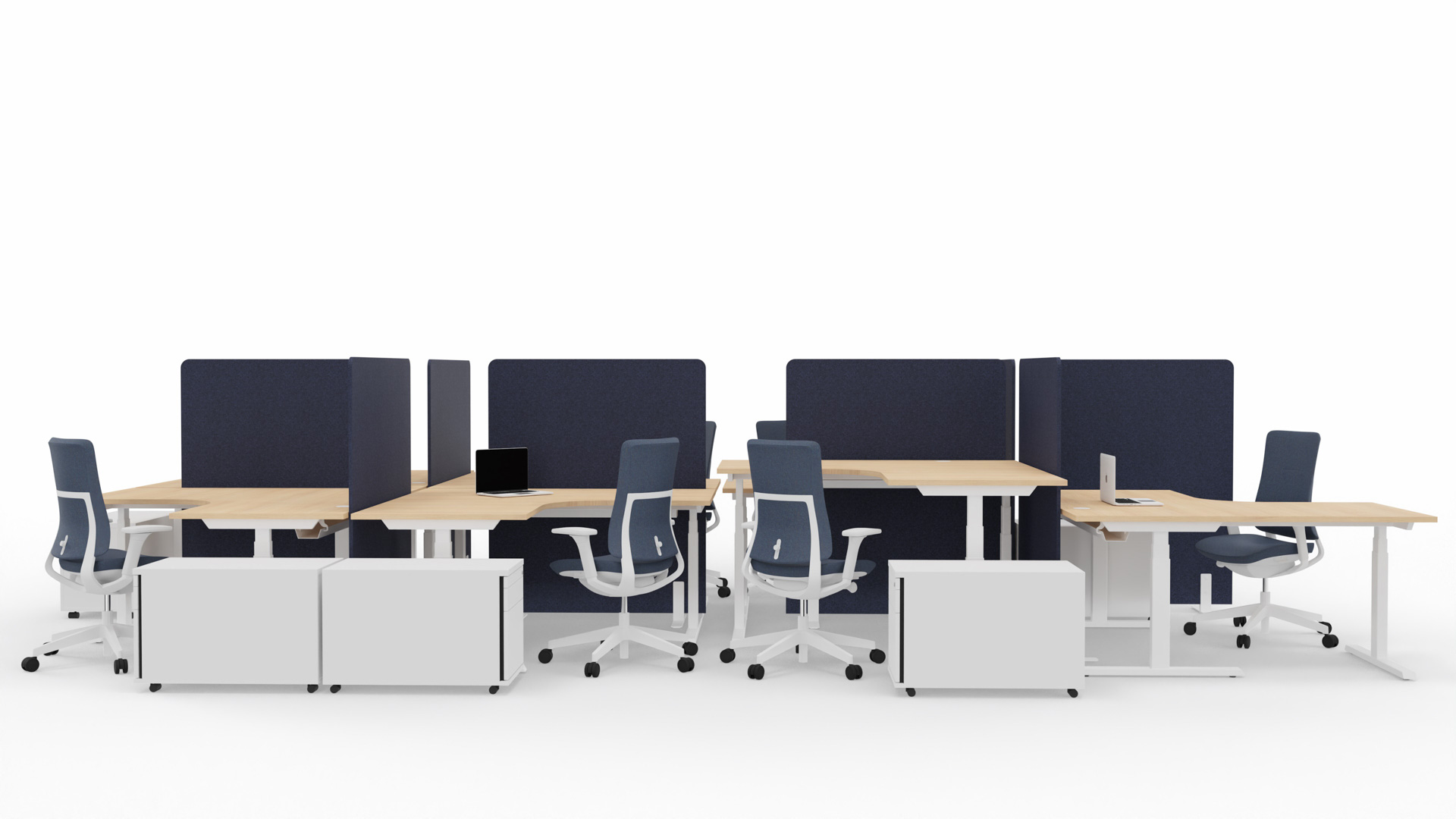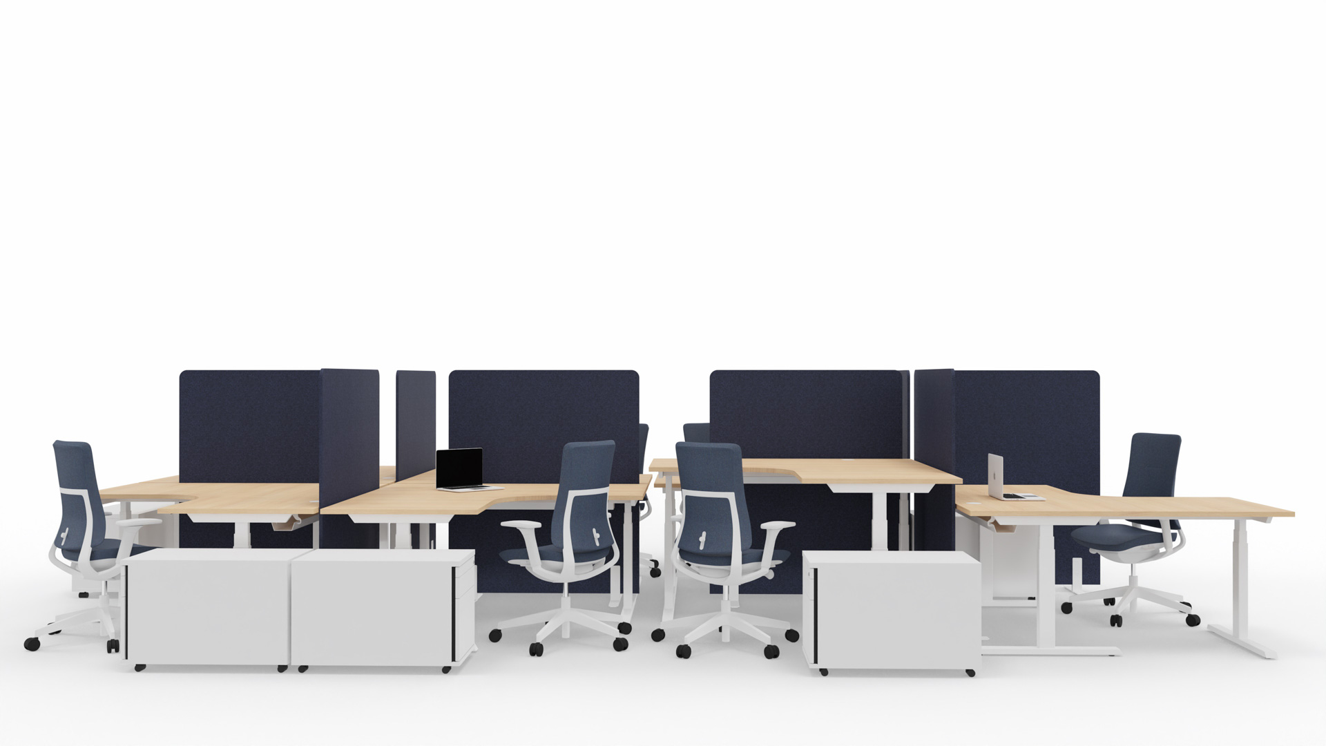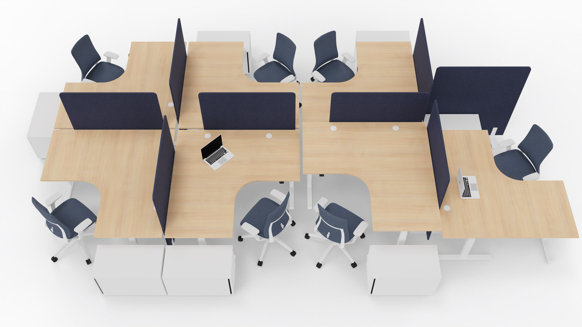 Układ L-kształtnych biurek Lano-E 300 T w połączeniu ze ściankami akustycznymi S40 doskonale sprawdzi się w otwartych przestrzeniach biurowych, gdzie istotna jest oszczędność miejsca przy zachowaniu dobrych warunków pracy indywidualnej. Dzięki elektrycznej regulacji wysokości blatu pracownik może bez problemu zmienić pozycję z siedzącej na stojącą, co znacząco wpływa na poprawę wydajności. Miejsce na przechowywanie zapewniają wygodne w użyciu kontenery mobilne TOP.