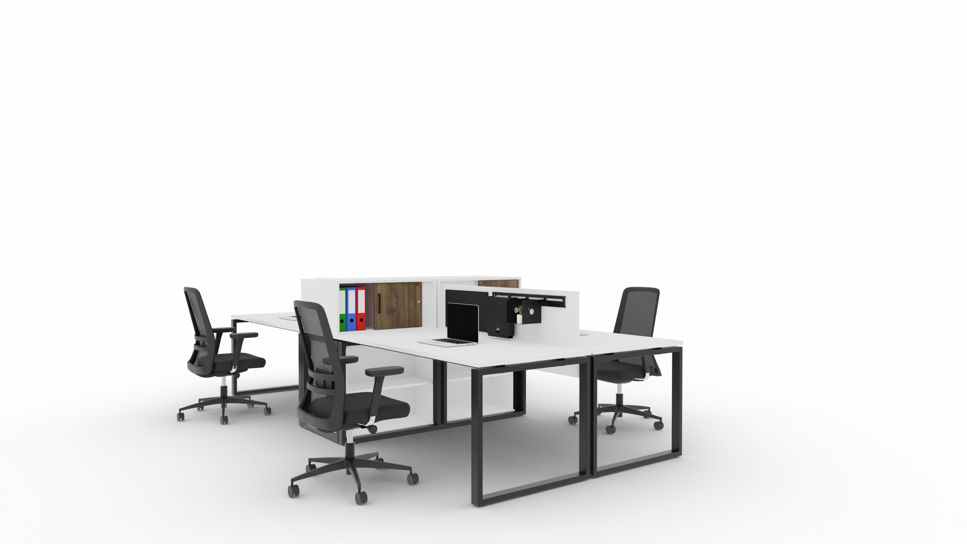 Układ biurek Q-eM charakteryzujący się zamkniętą nogą i delikatnie zdystansowanym blatem połączony jest z szafkami podbiurkowymi i dwustronnymi nadstawkami z drzwiami przesuwnymi, umiejscowionymi na blatach biurek. Przegrody płytowe zapewniają pracownikom prywatność i lepszą izolację akustyczną. Stanowiska wieloosobowe doskonale sprawdzą się w miejscach wymagających zarówno pracy indywidualnej jak i grupowej.