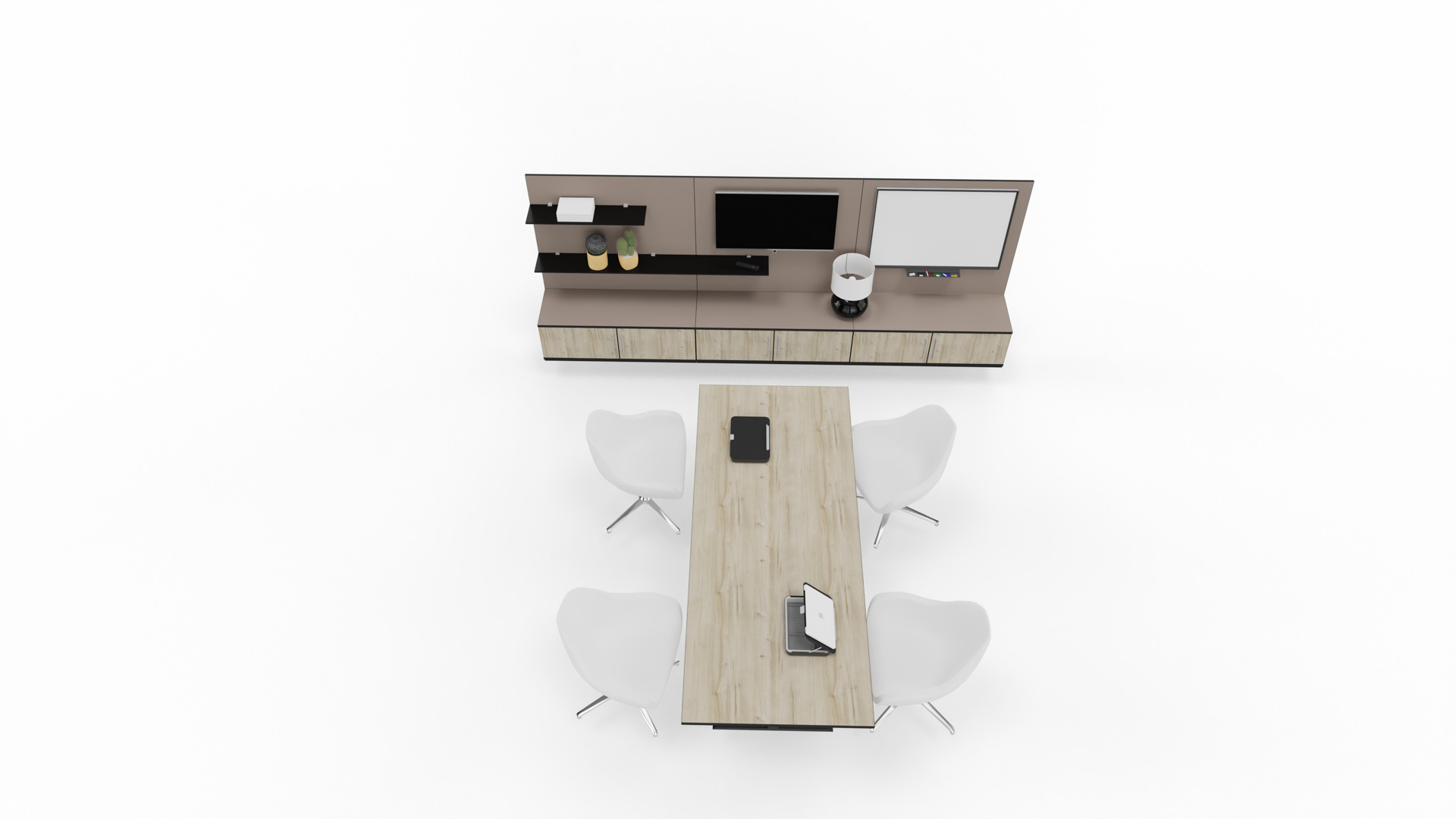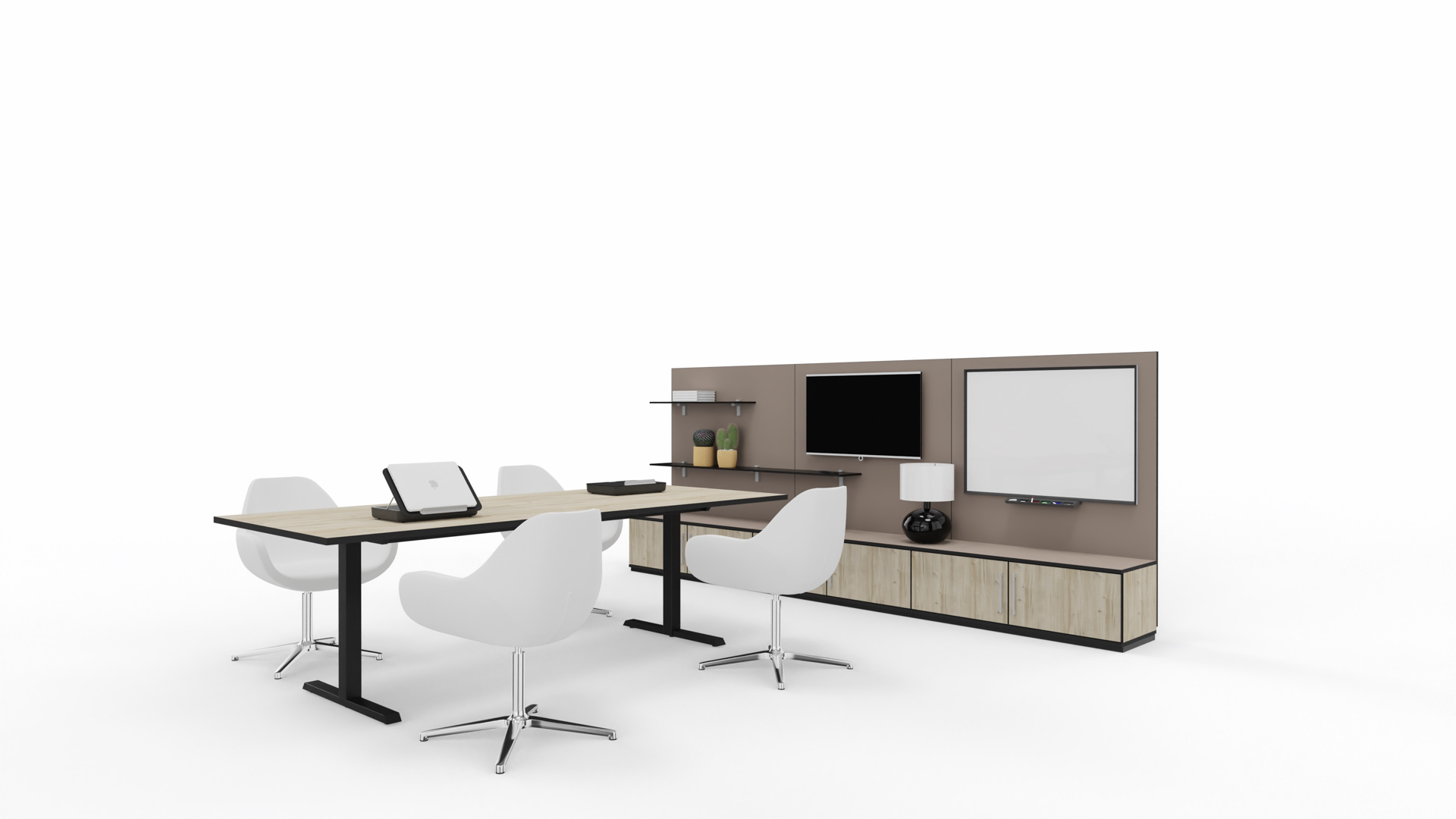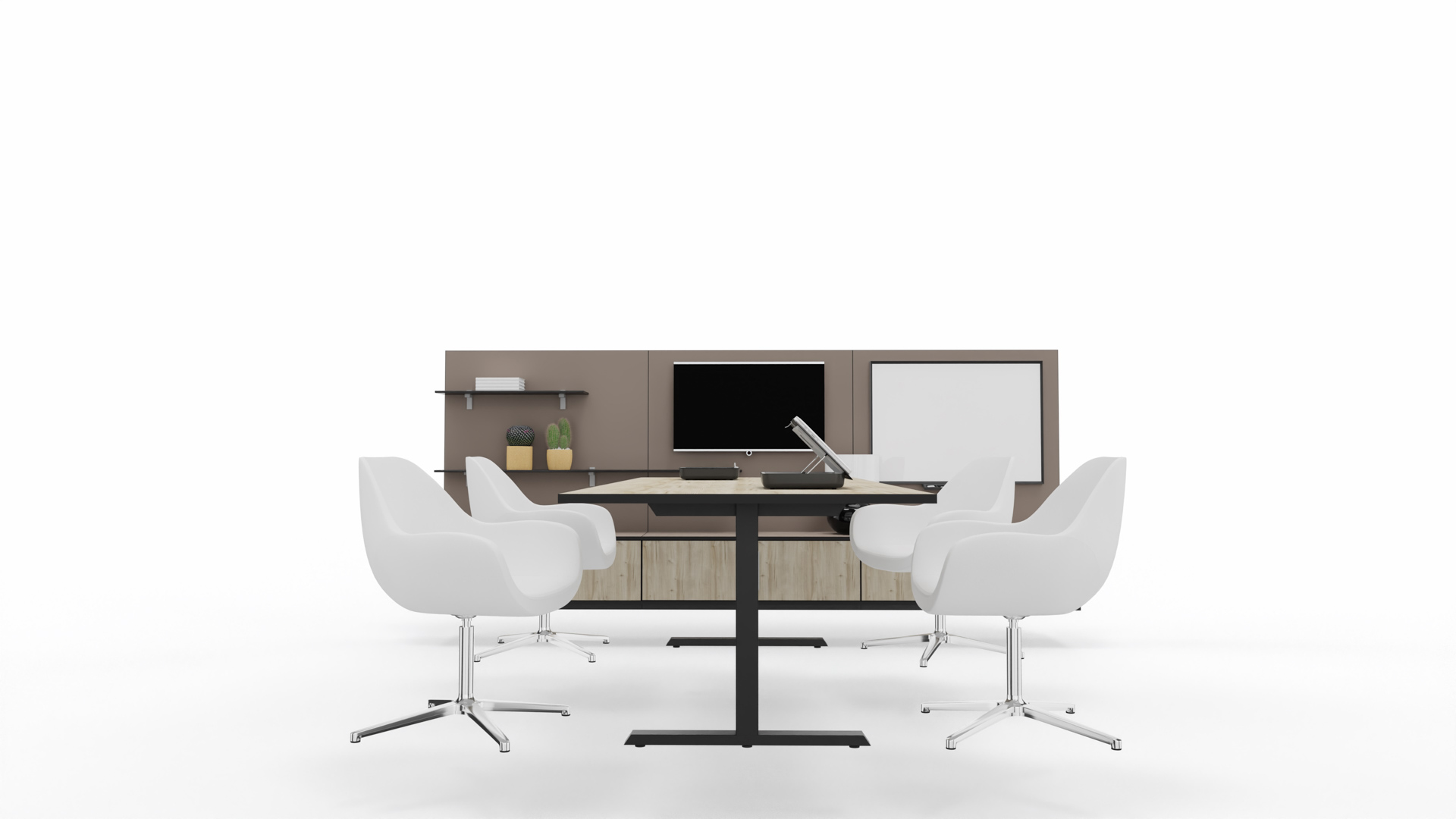 Aranżacja przestrzeni przeznaczona jest zarówno na spotkania jak i pracę zespołową. Stoły L-Line zapewniają komfortową i sprawną współpracę. Dopracowana konstrukcja sprawia, że wymogi estetyczne nie ustępują wymogom ergonomicznym - stoły posiadają funkcjonalność w postaci pionowych kanałów kanałów kablowych w zintegrowanych nogach.