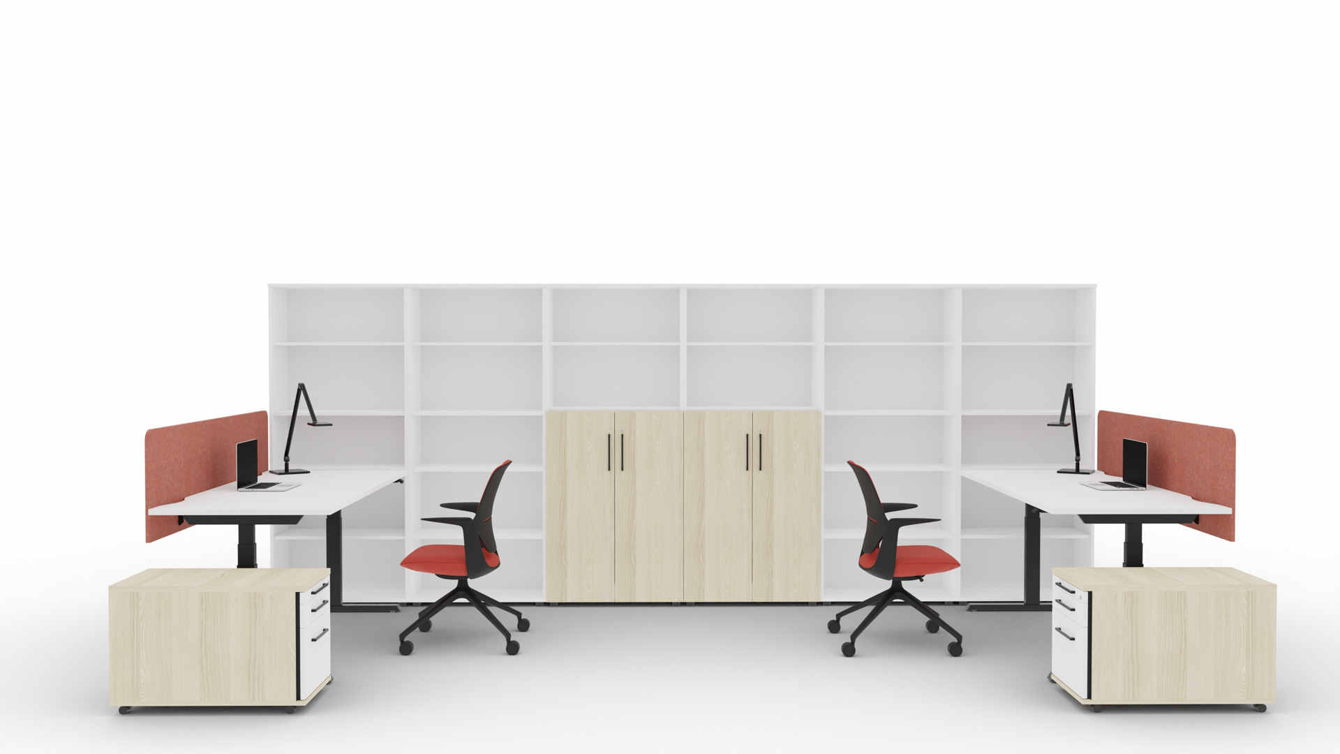 Strefa pracy indywidualnej zaaranżowana została z wykorzystaniem biurek Lano-E 300 T. Regulacja wysokości blatu zapewnia pracownikowi możliwość zmiany pozycji oraz zmniejsza zmęczenie. Zastosowanie przegród tapicerowanych redukuje hałasy z otoczenia i pozwala na pracę w skupieniu, a regały i szafy Op-Lite zapewniają miejsce do przechowywania dokumentów i akcesoriów. Dzięki tym atrybutom układ sprawdzi się zarówno w mniejszych jak i większych biurach.