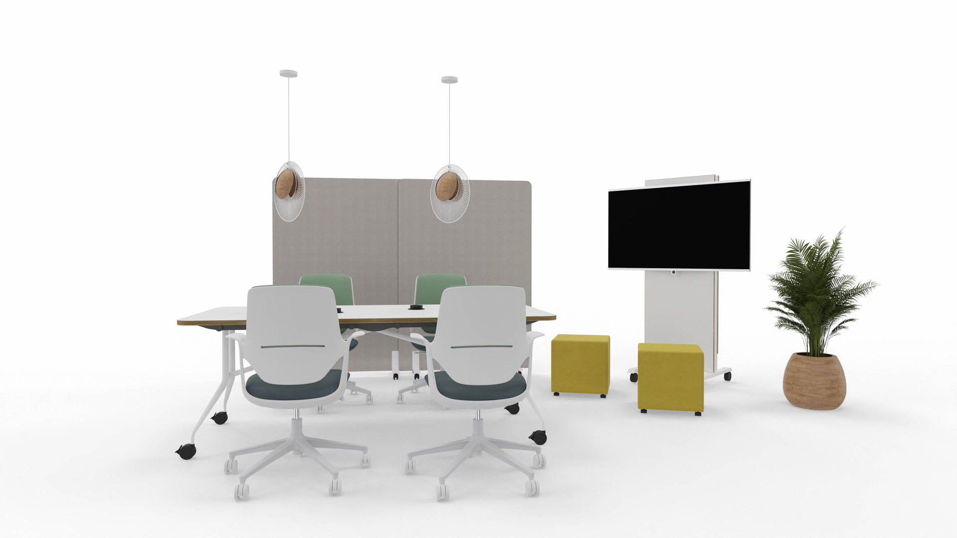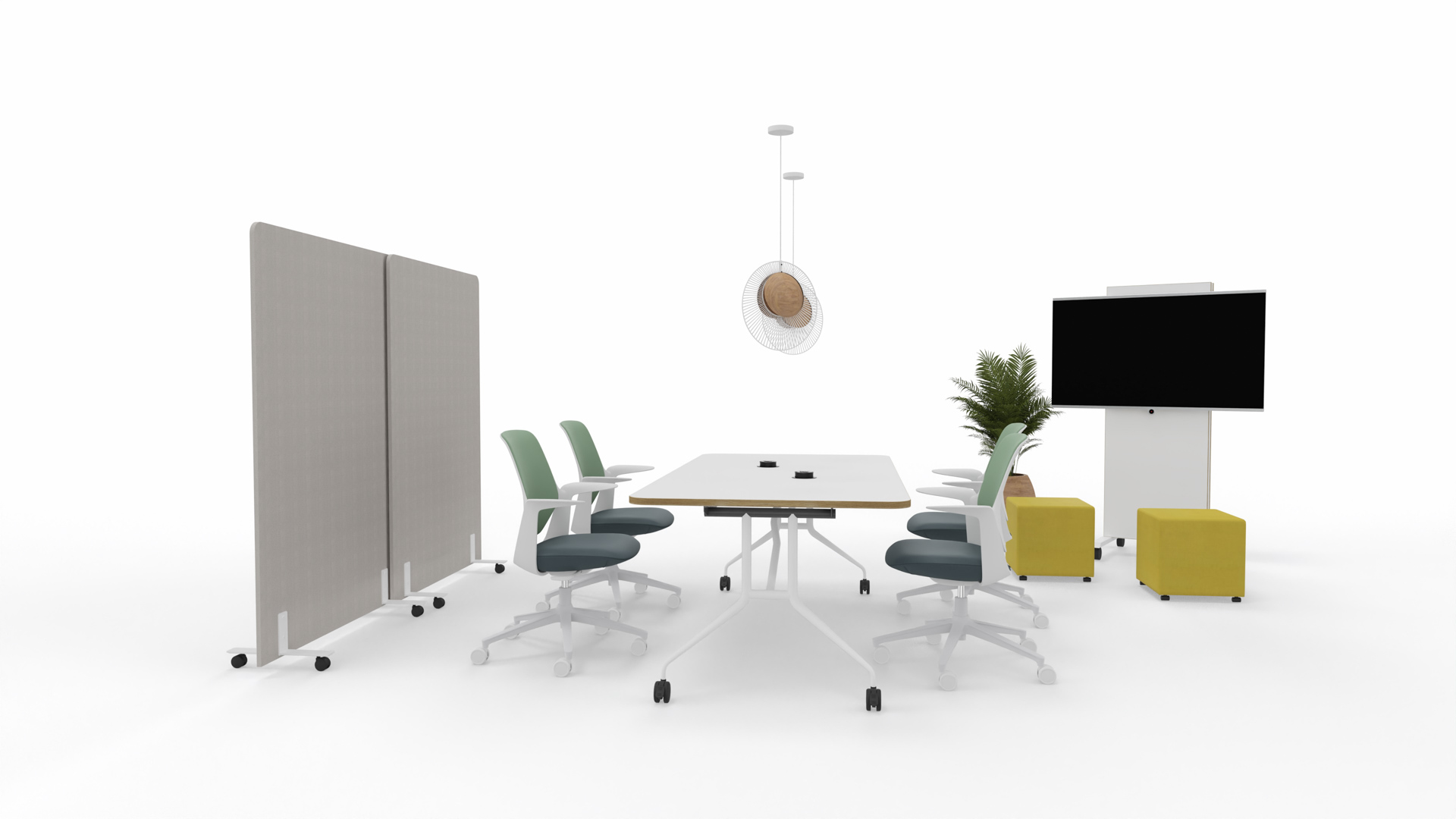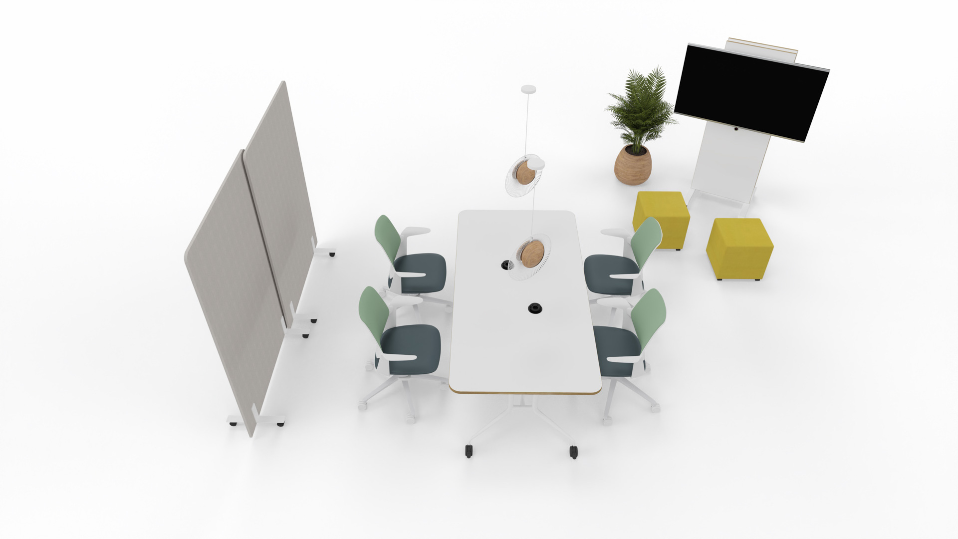 Stół Sirio Mobile z mediaportem Power Circle pomagającym ukryć kable i zachować porządek, to idealne rozwiązanie wielofunkcyjne pozwalające na szybką i łatwą zmianę aranżacji biura. Ścianki akustyczne S40 oraz stojak TV dzięki dużej mobilności zapewniają swobodę kształtowania przestrzeni, wydzielając wygodne i ciche miejsce pracy lub spotkań.