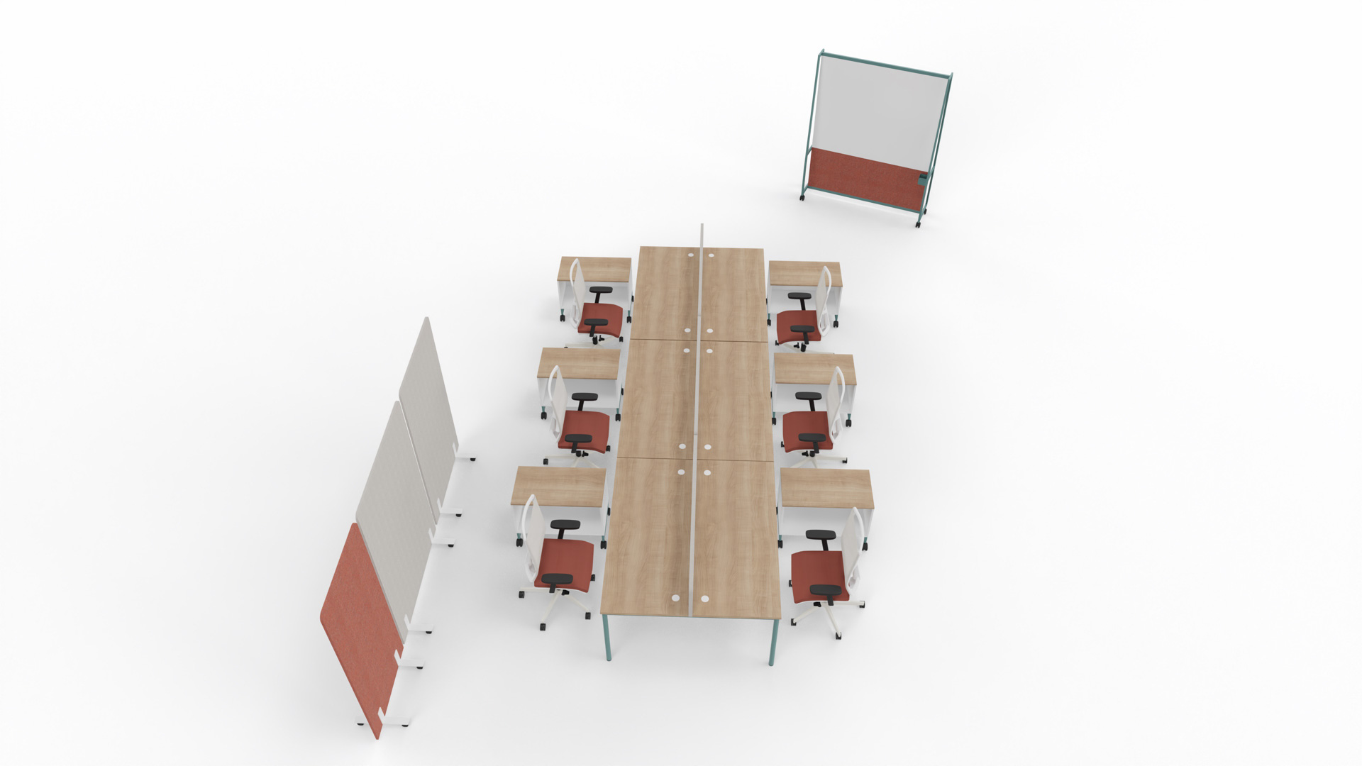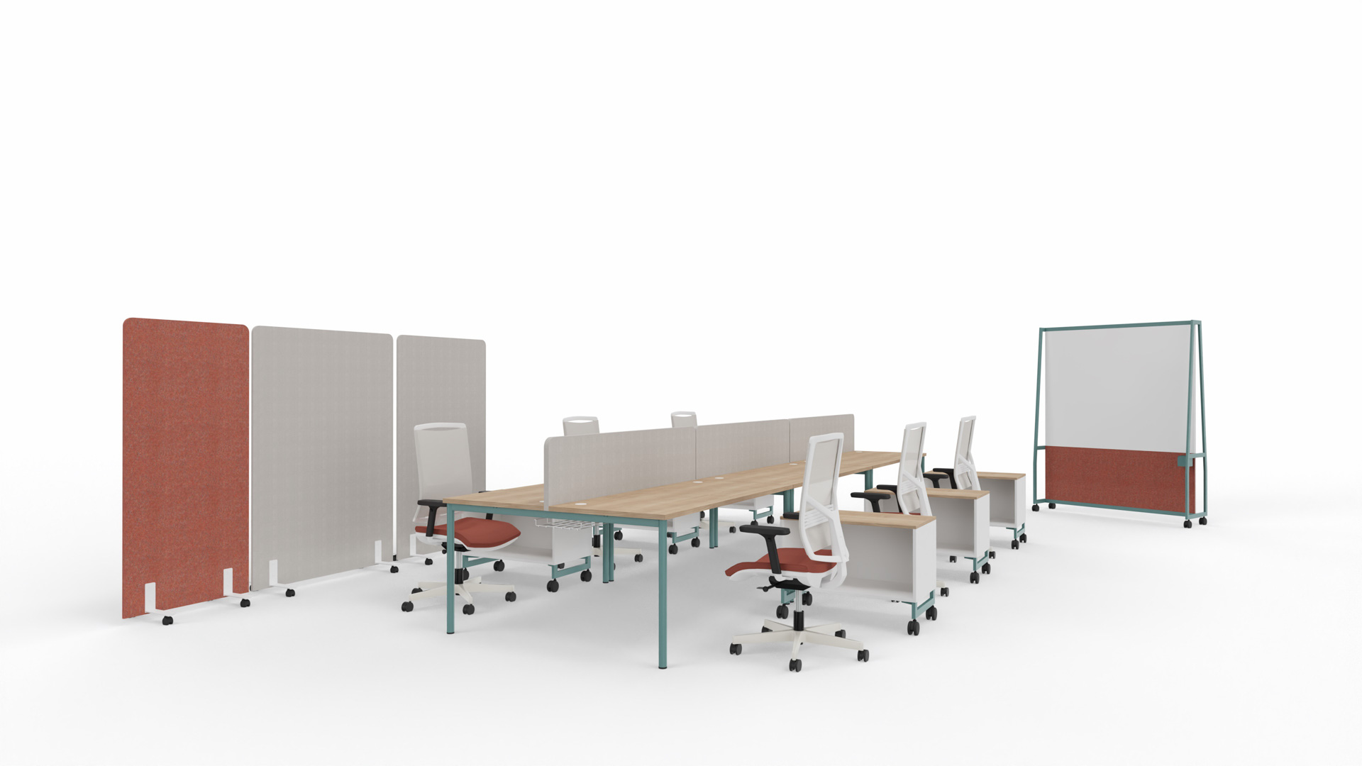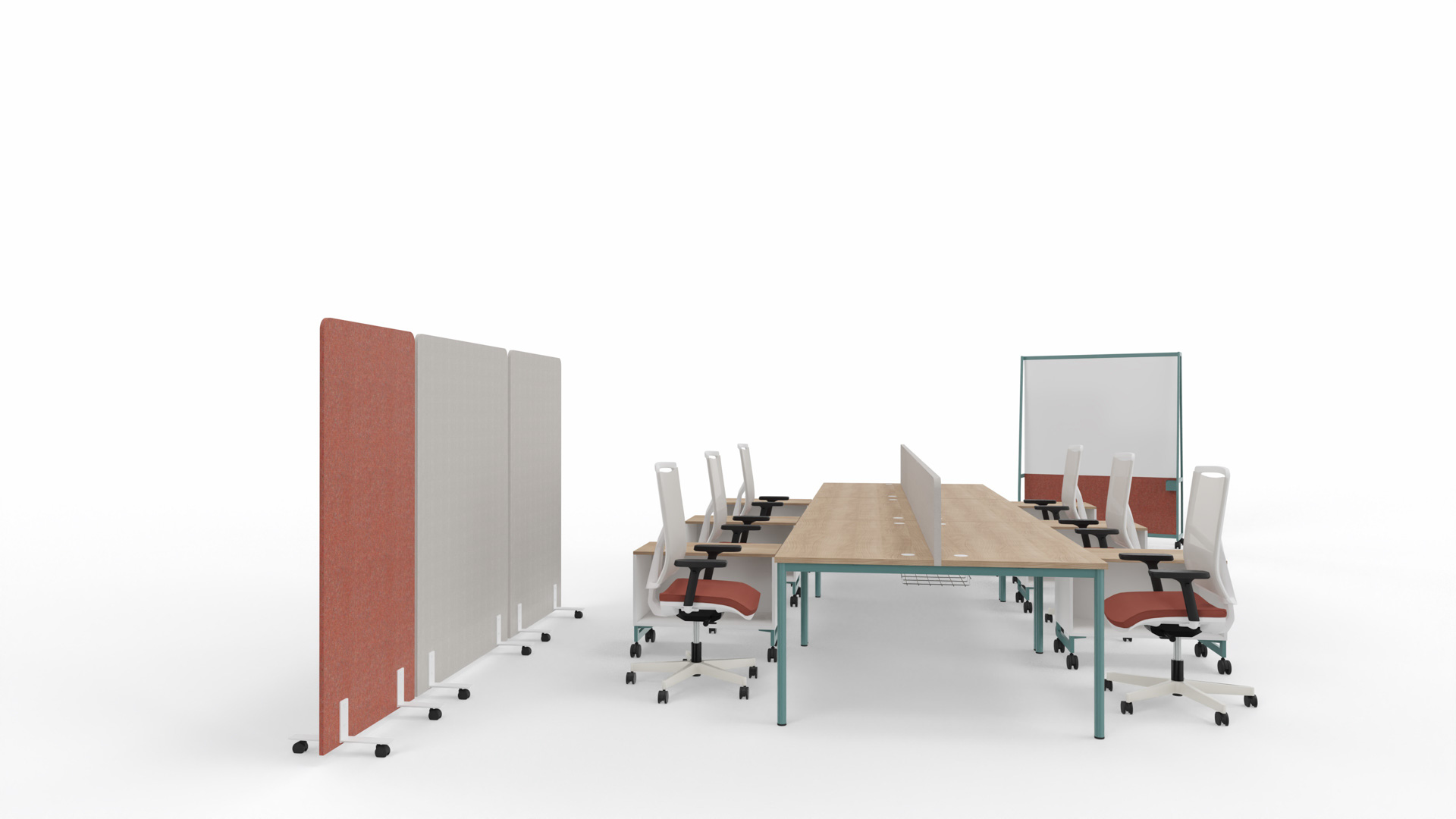 Biurka Bench Op-Lite to rozwiązanie gwarantujące zachowanie równowagi pomiędzy wymianą informacji, a komfortem pracy w skupieniu. Mobilne ścianki działowe S40 i Wariant z tkaniną wygłuszającą i tablicą suchościeralną ułatwiają pracę zespołową, zapewniając lepsze warunki akustyczne i prywatność.