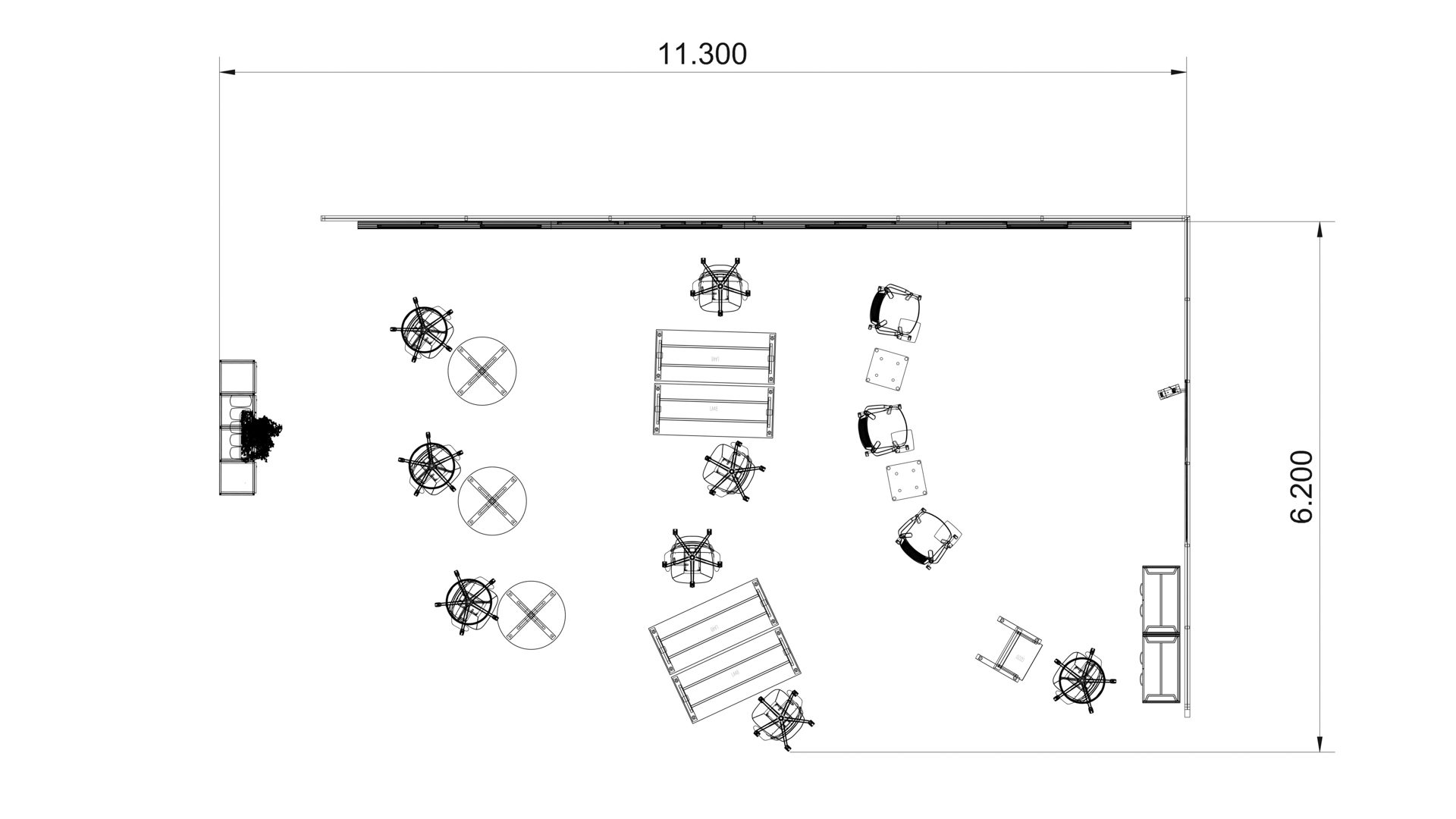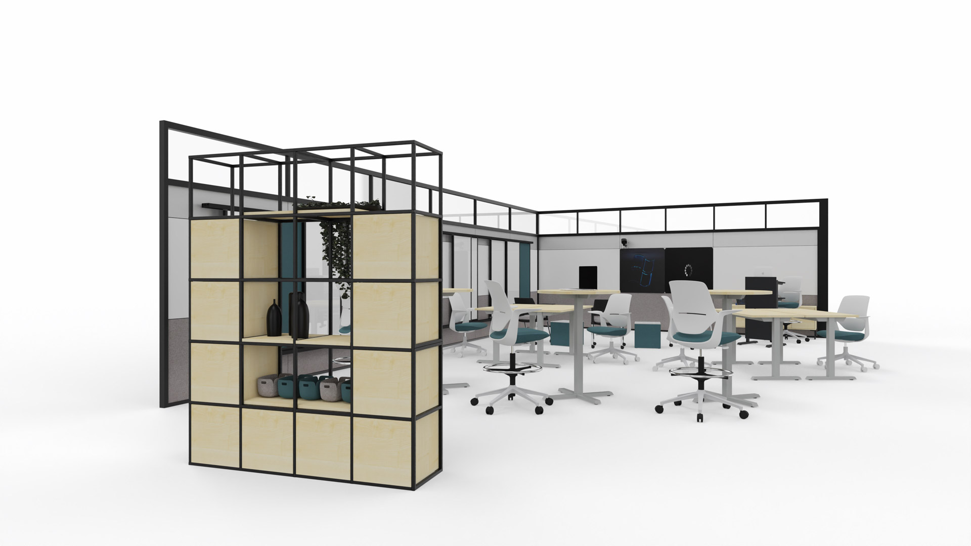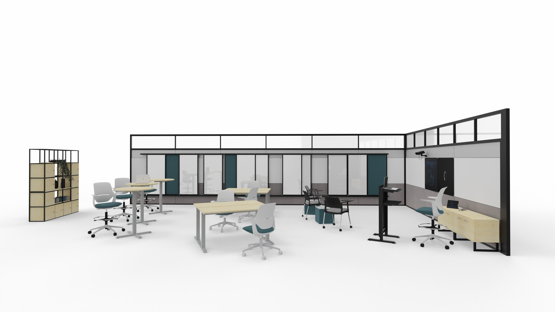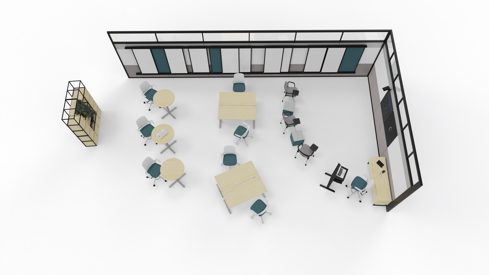 Prezentowany układ przestrzenny sprawdzi się w przestrzeni biurowej przeznaczonej do spotkań i prezentacji. Szafki Wariant w połączeniu z systemem regałów Aura zapewniają nowoczesną stylistykę i nadają pomieszczeniu charakter. Uzupełnieniem układu są okrągłe stoły L-Line. Mównica daje stabilne oparcie osobie prowadzącej spotkanie oraz zapewnia dyskretne miejsce do odkładania laptopa czy notatek.