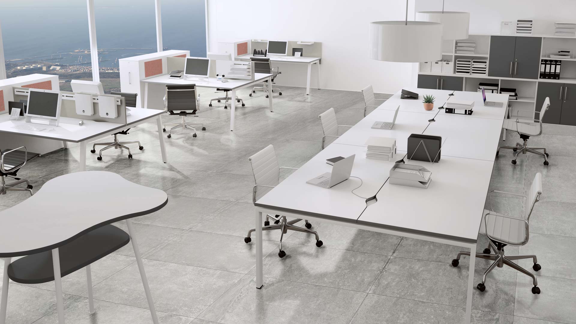 Stanowiska wieloosobowe A-eM Bench to rozwiązania gwarantujące zachowanie równowagi pomiędzy komfortem pracy, a racjonalnym wykorzystaniem przestrzeni biurowej