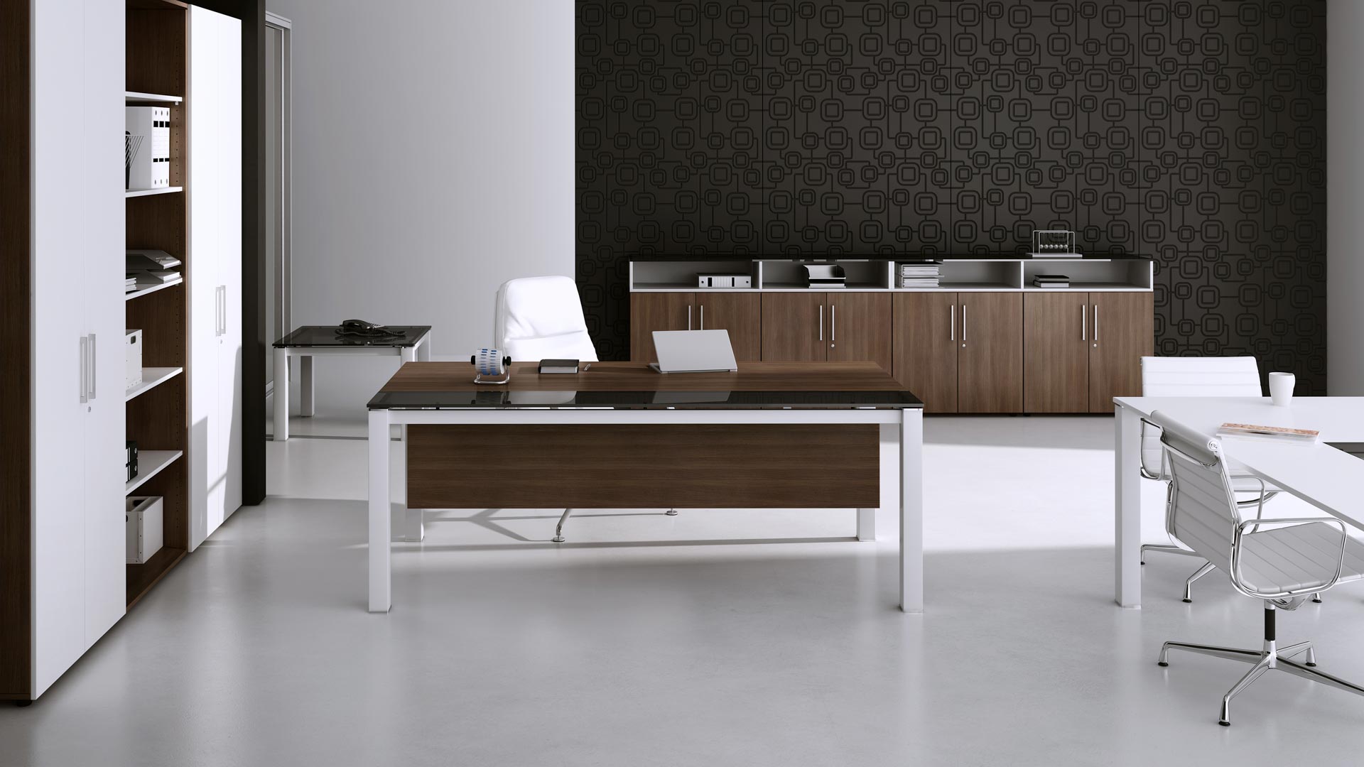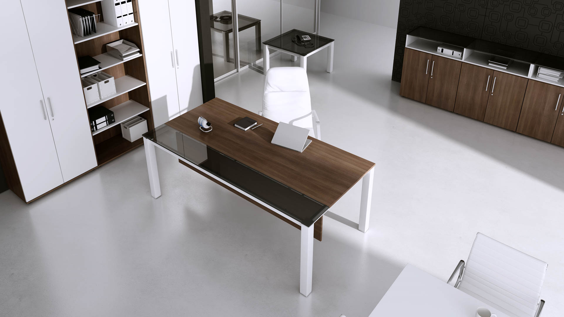 Biurka gabinetowe Graf to klasyczne połączenie prostoty formy z wyszukanym stylem. Charakter produktu podkreślają szklane wstawki oraz chromowane elementy dekoracyjne.