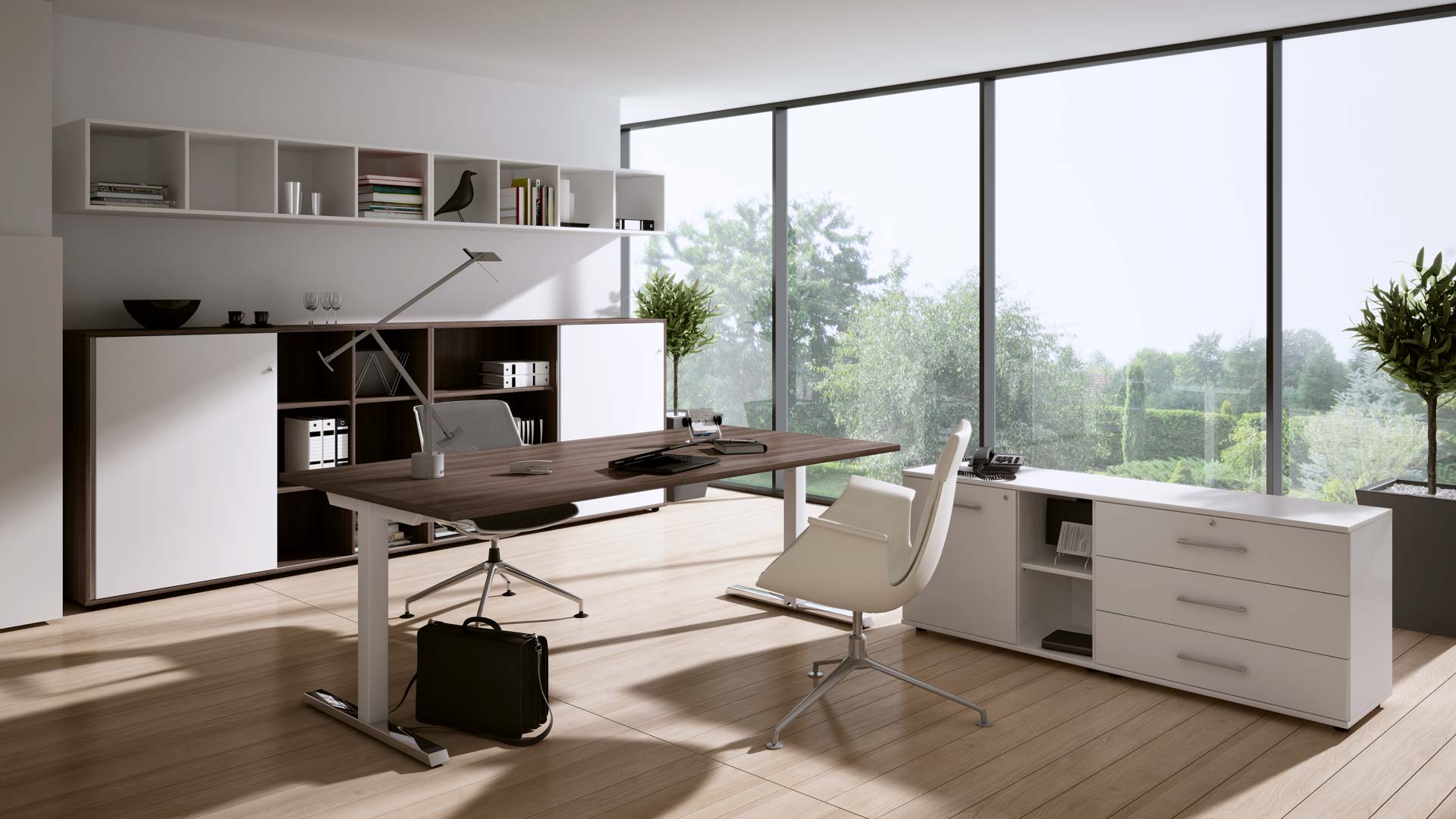 Biurka z systemu Lano-T tworzą funkcjonalne stanowiska pracy. Wyróżnikiem kolekcji jest podstawa w kształcie litery T.